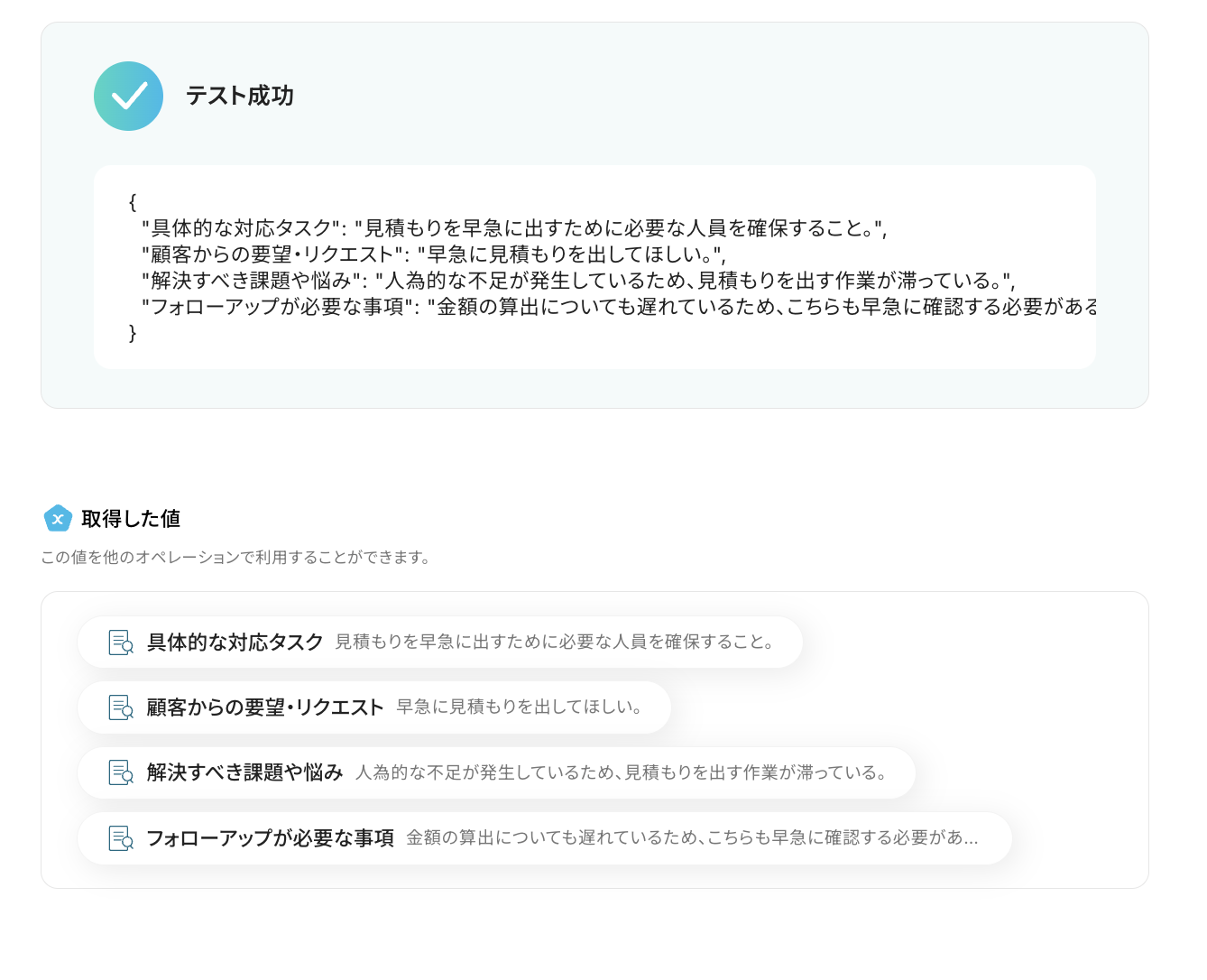 「テスト成功」と表示がされたら、抽出された項目が取得した値に反映されています。