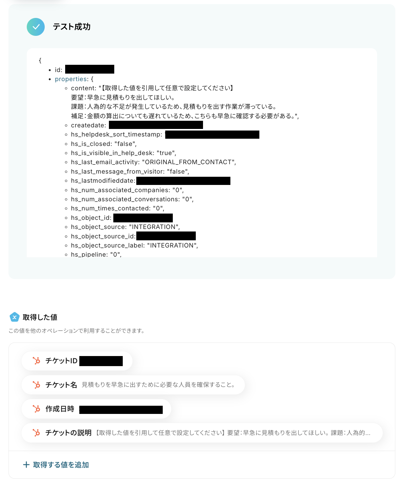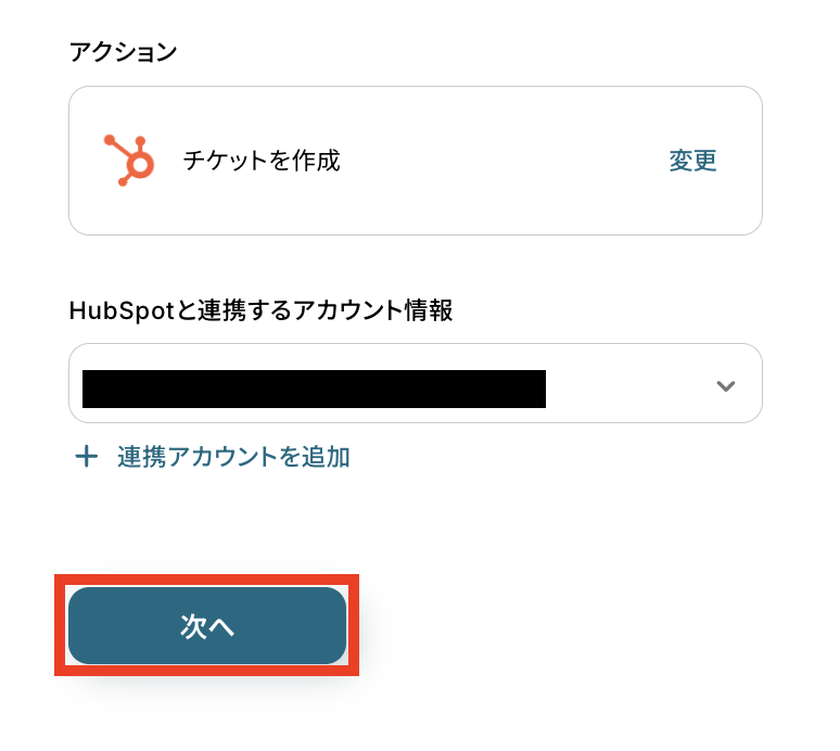 これまでに取得した値を使用して、HubSpotにチケットを作成する設定を行います。