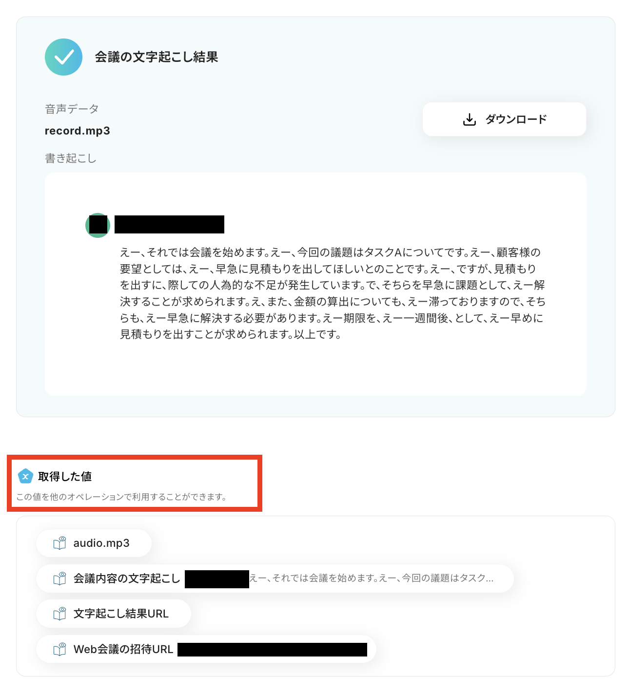 文字起こし結果と取得した値が確認できたら、「保存する」ボタンを押しておきましょう!