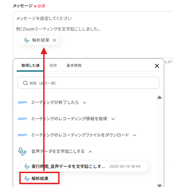 3.「ミーティングID」は先ほど取得したアウトプットから「ミーティングID」選択します。