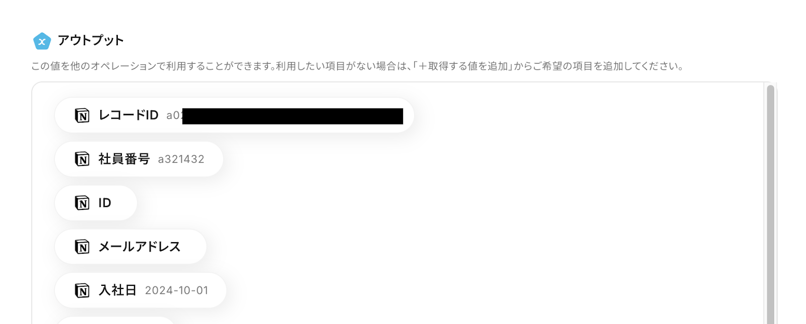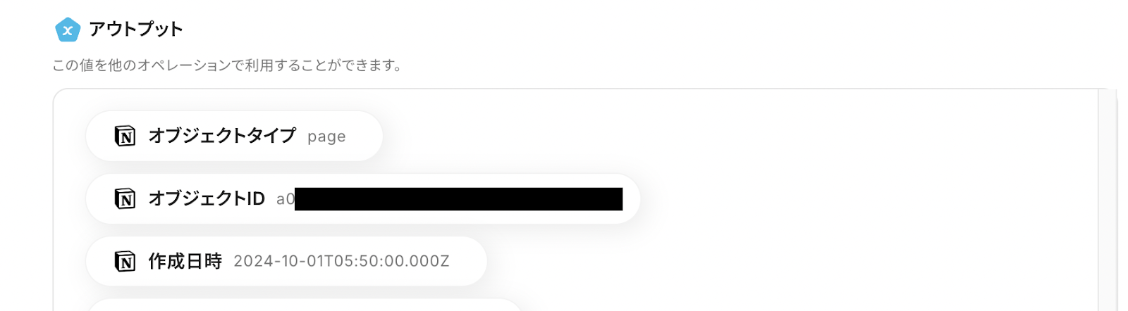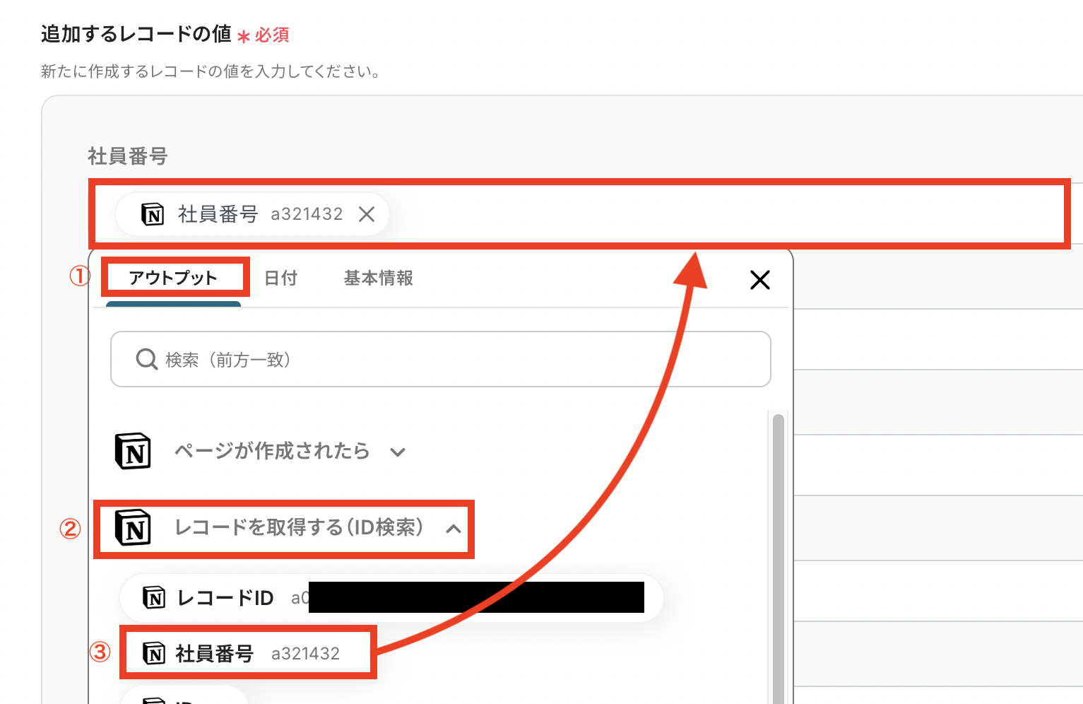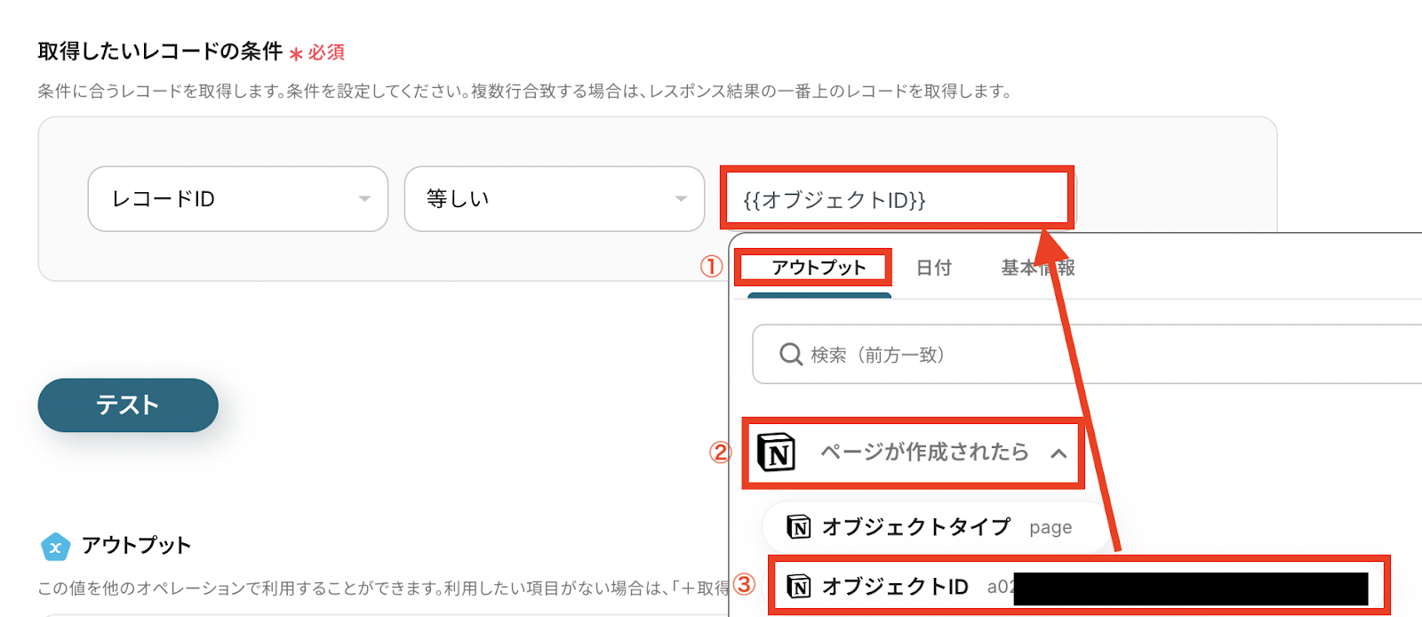 「次へ」を押すと「取得したいレコードの条件」の入力を求められるので、アウトプットを活用して入力します。 【アウトプットの活用方法】 ①入力欄をクリックして「アウトプット」を表示 ②「ページが作成されたら」をクリック ③「オブジェクトID」を入力」