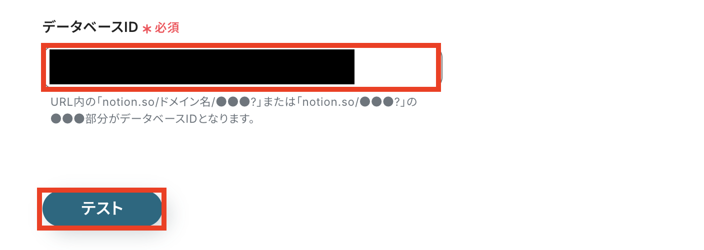 「データベースID」を入力したら「テスト」を押しましょう。 ※NotionのID確認方法はこちら をご確認ください。