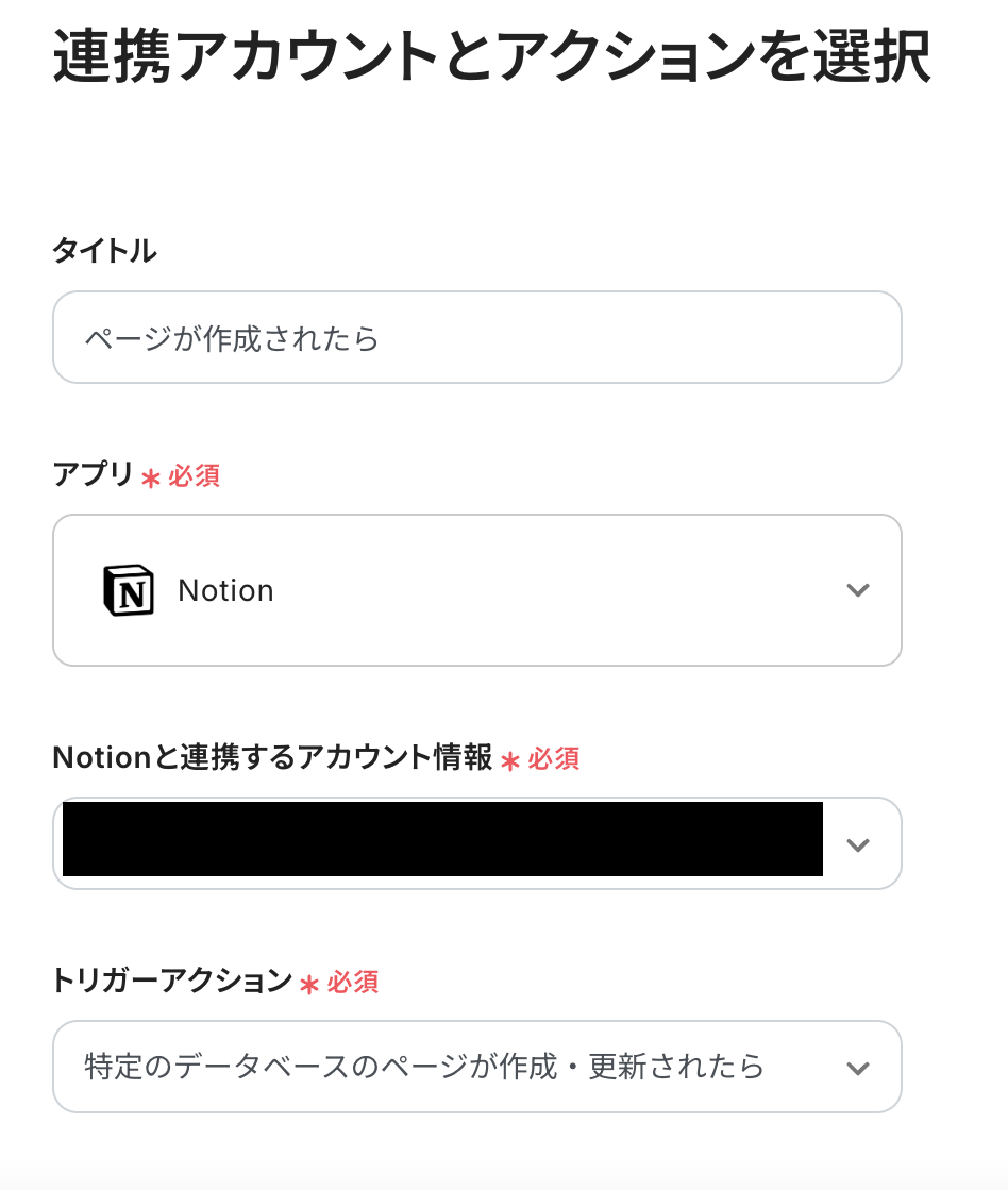 必要箇所を入力していきましょう。 「タイトル」:必要に応じて変更可能 「Notionと連携するアカウント情報」:合っているか確認 「トリガーアクション」:「特定のデータベースのページが作成・更新されたら」を選択