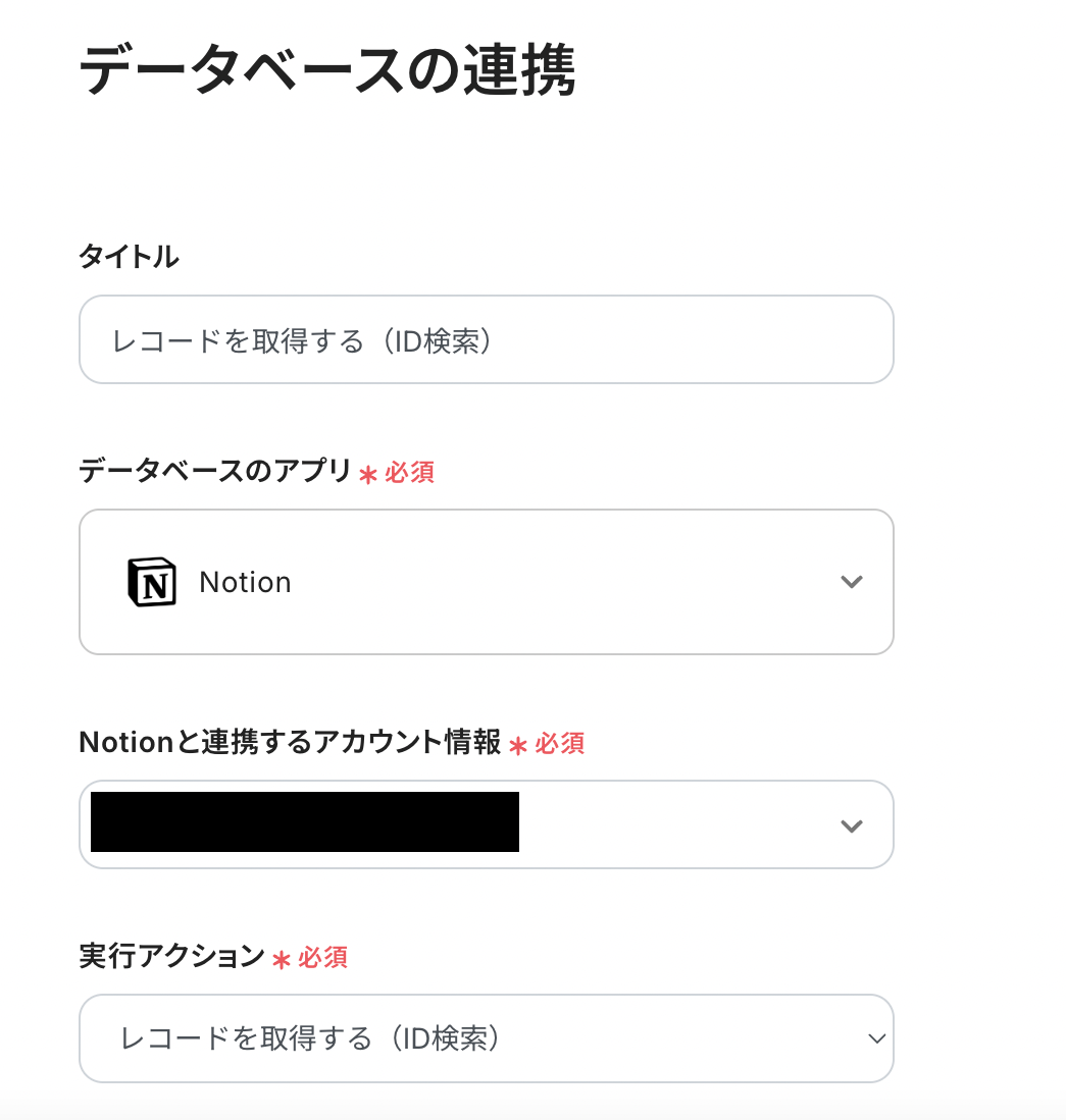 必要箇所を入力していきます。 「タイトル」:必要に応じて変更可能 「Notionと連携するアカウント情報」:合っているか確認 「実行アクション」:「レコードを取得する(ID検索)」を選択