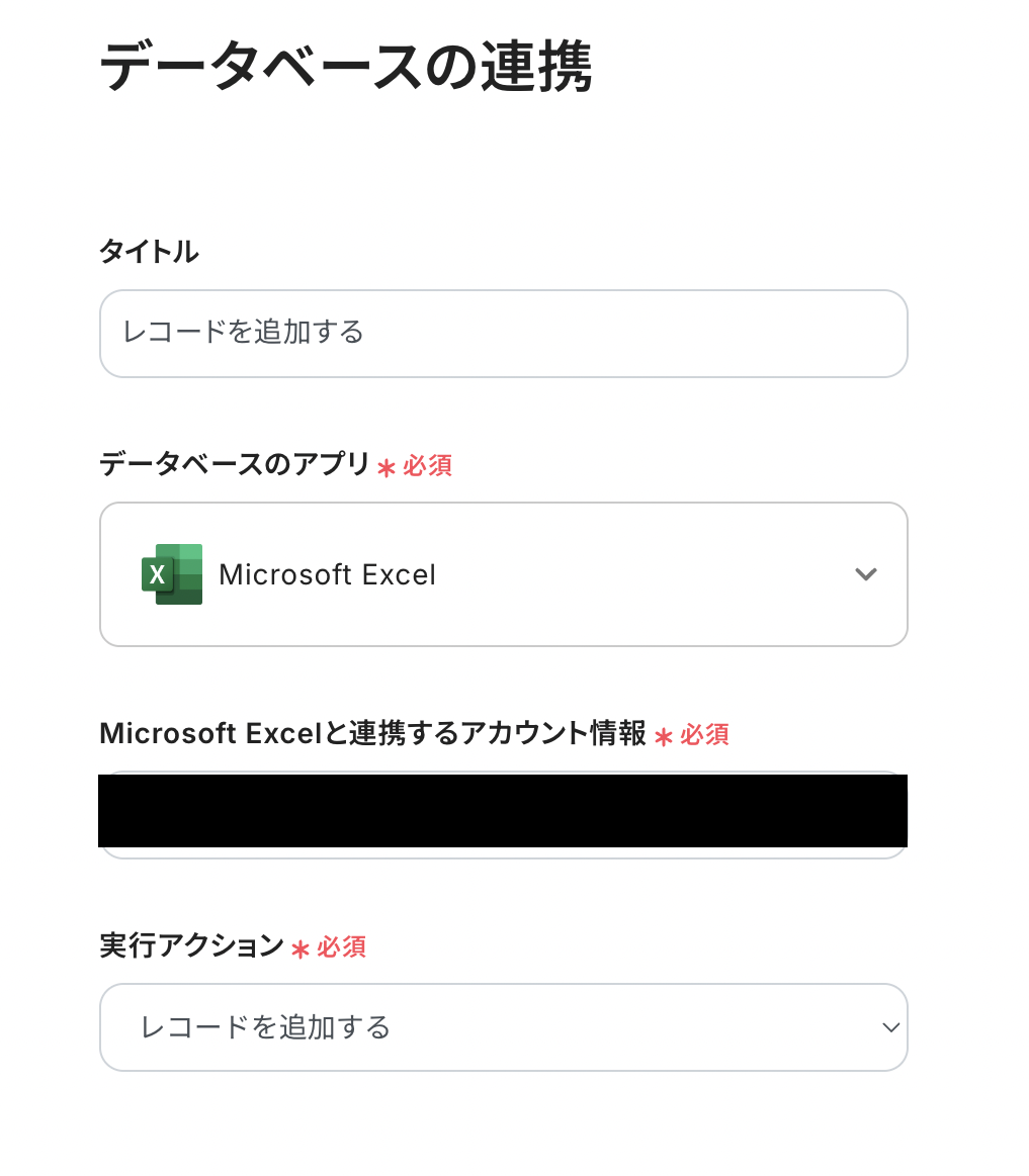 必要箇所を入力していきます。 「タイトル」:必要に応じて変更可能 「Microsoft Excelと連携するアカウント情報」:合っているか確認 「実行アクション」:「レコードを追加する」を選択