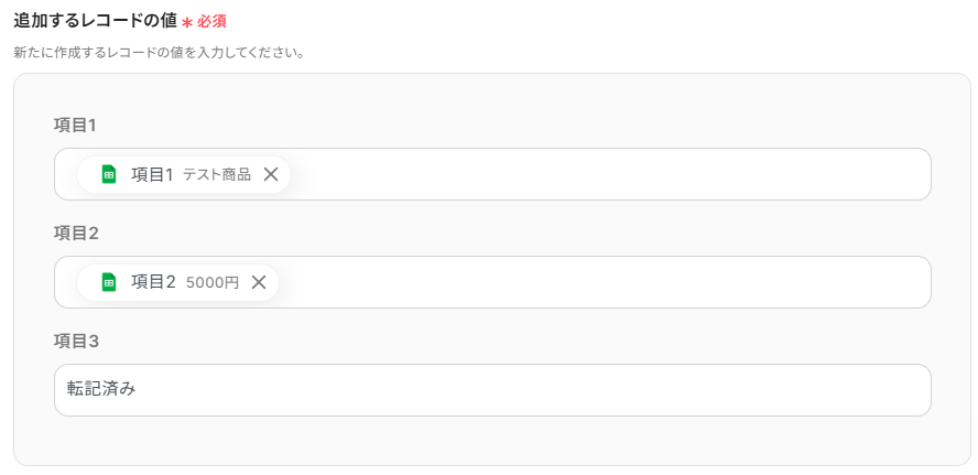 下記赤枠のように、設定した通りのレコード内容で追加されていればOKです!