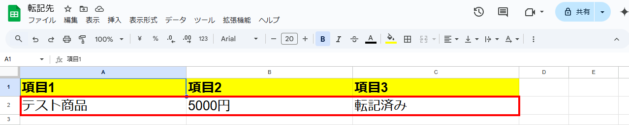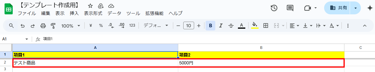 また、Google スプレッドシートを作成する際は、項目だけでなく下記赤枠のように項目の内容も入力しましょう。項目内容も入力することで、この後のテスト操作がスムーズに行えます!