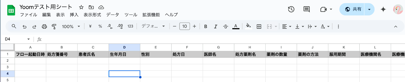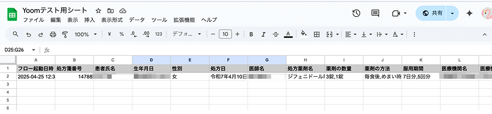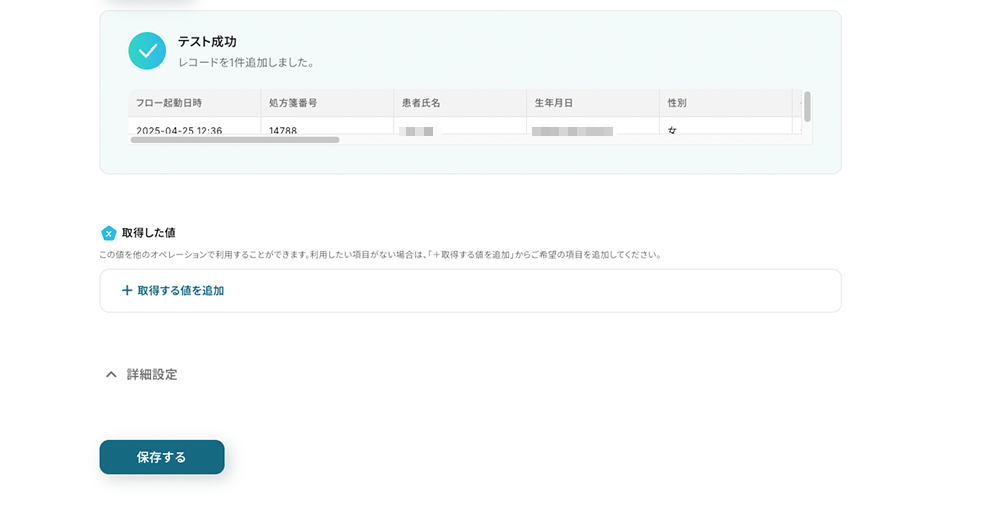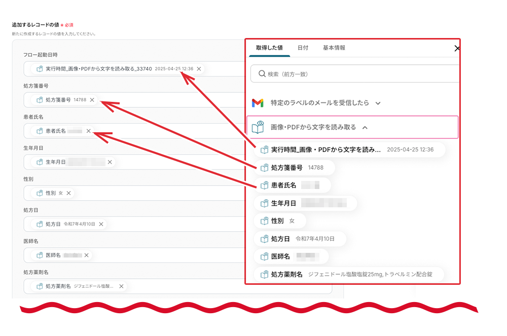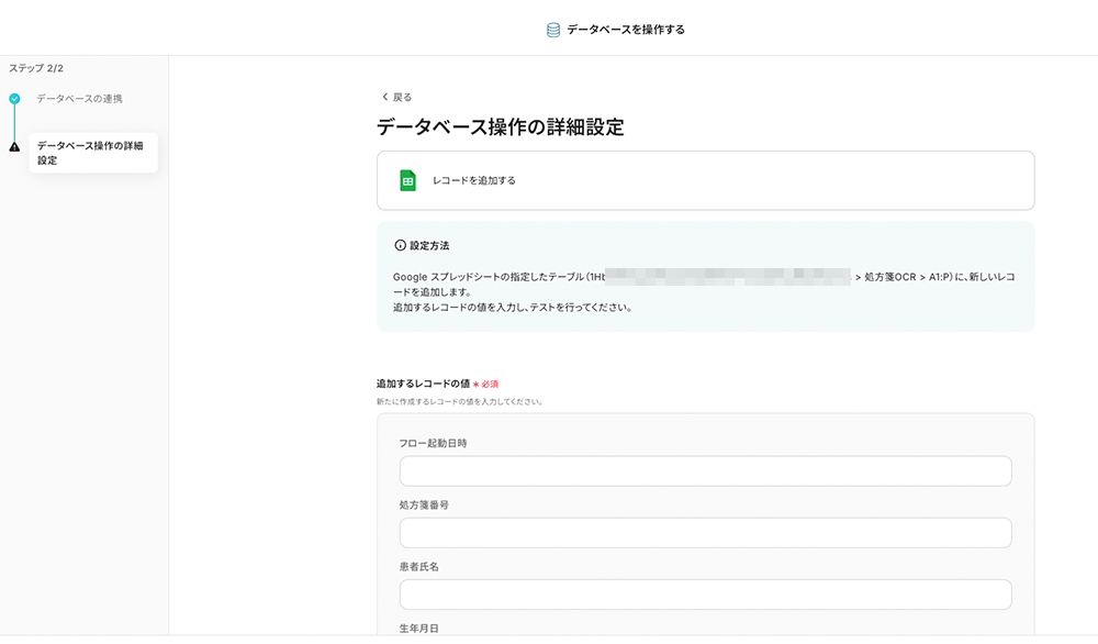 追加するレコードの値 前の画面で指定したスプレッドシートの項目を読み込んだ画面が表示されます。それぞれの項目に、抽出した処方箋の値をリンクさせます。