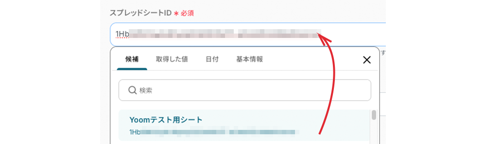 スプレッドシートID 編集欄をクリックすると、プルダウンメニューが表示され、連携したアカウントに権限があるシートが候補として表示されます。選択すると、IDを引用できます。