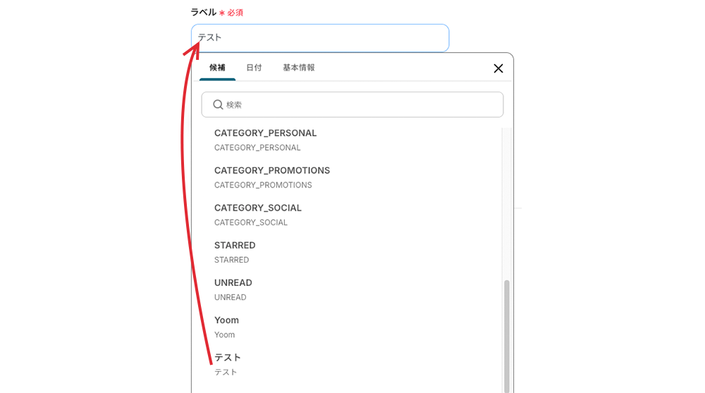 Gmailのラベルの準備ができたら、Yoomの画面でどのラベルにするか選択します。