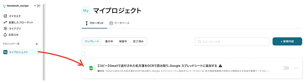 コピーしたテンプレートは、マイプロジェクトに追加されます。マイプロジェクトは左のメニューバーからアクセス可能です。