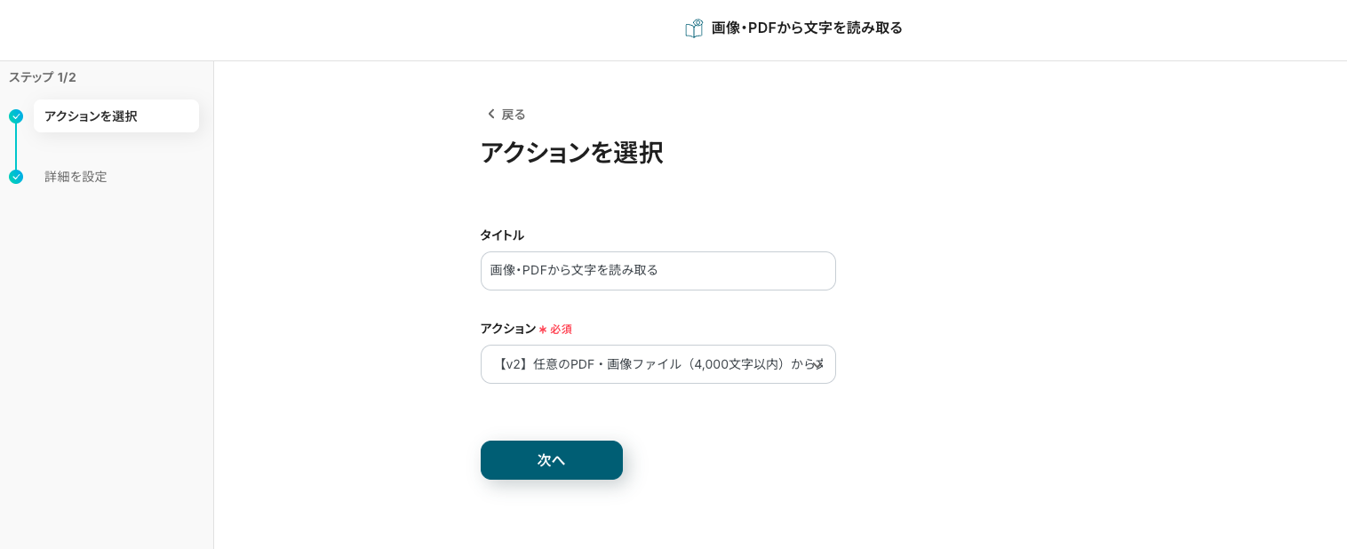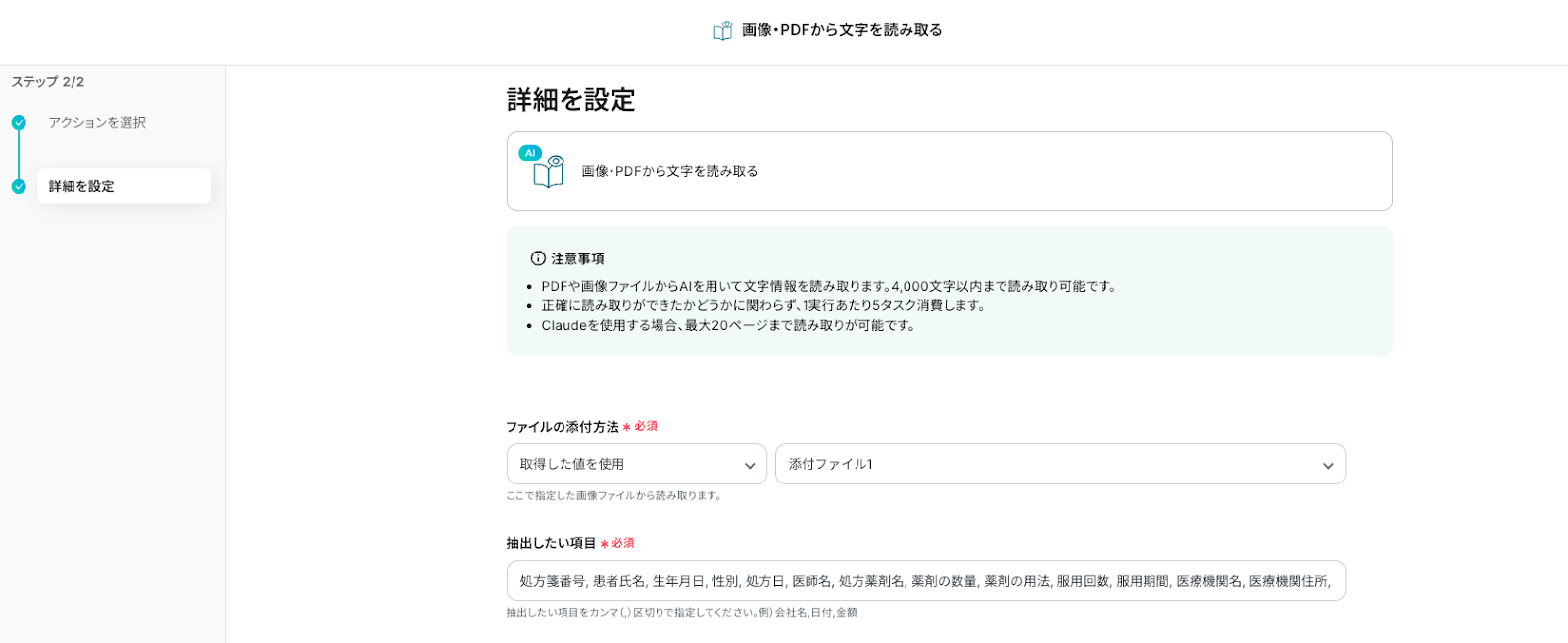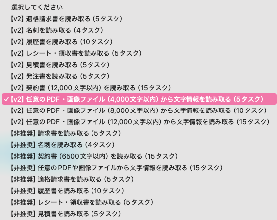 アクション 事前設定済みのため、追加の操作は不要です。ちなみに、選択肢は以下になります。読み取る文字数が多いほど消費タスクも増えます。