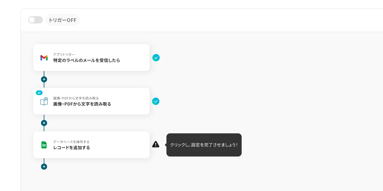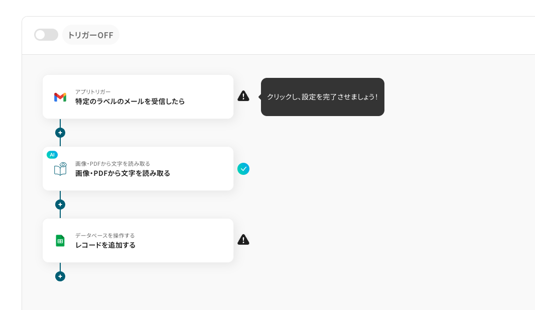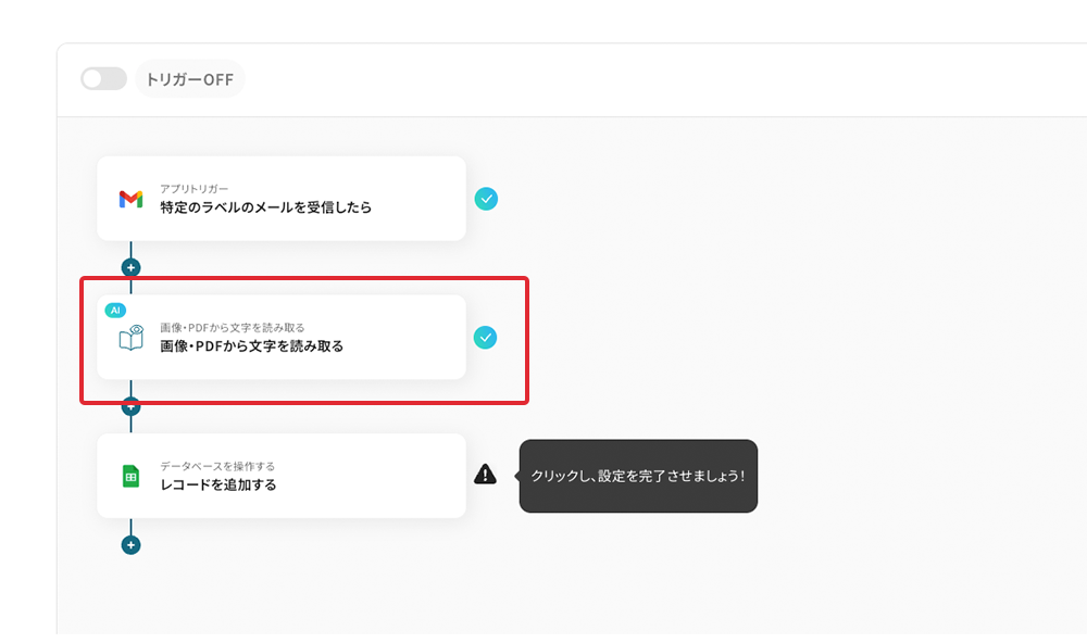 Gmailのトリガー設定とOCR、Google スプレッドシートのアクション設定
