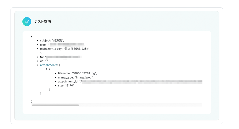 これは、Yoomが指定したGmailに正しくつながり、指定のラベルに入ったメールの最新情報が問題なく取得できていることを示すテスト結果です。