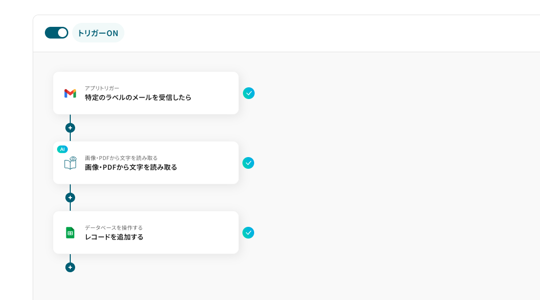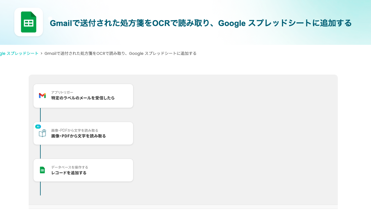 それでは、ここから実際に自動化を導入する設定方法について紹介します! 今回はより具体的な例として、「Gmailで送付された処方箋をOCRで読み取り、Google スプレッドシートに追加する」 フローの作成手順を解説します。このフローを使えば、メールで届いた処方箋の情報を自動でデータ化できます!