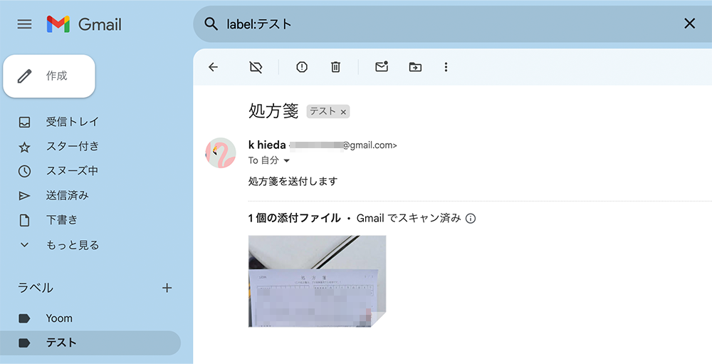 テスト用メールを送信してください。処方箋の画像(JPEG,PNG,PDF)を添付してくださいね。