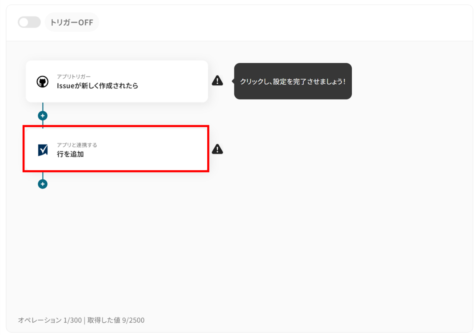 - 最後に、オペレーションでSmartsheetの「行を追加」アクションを設定し、GitHubのIssue情報を基に新しい行を追加します。