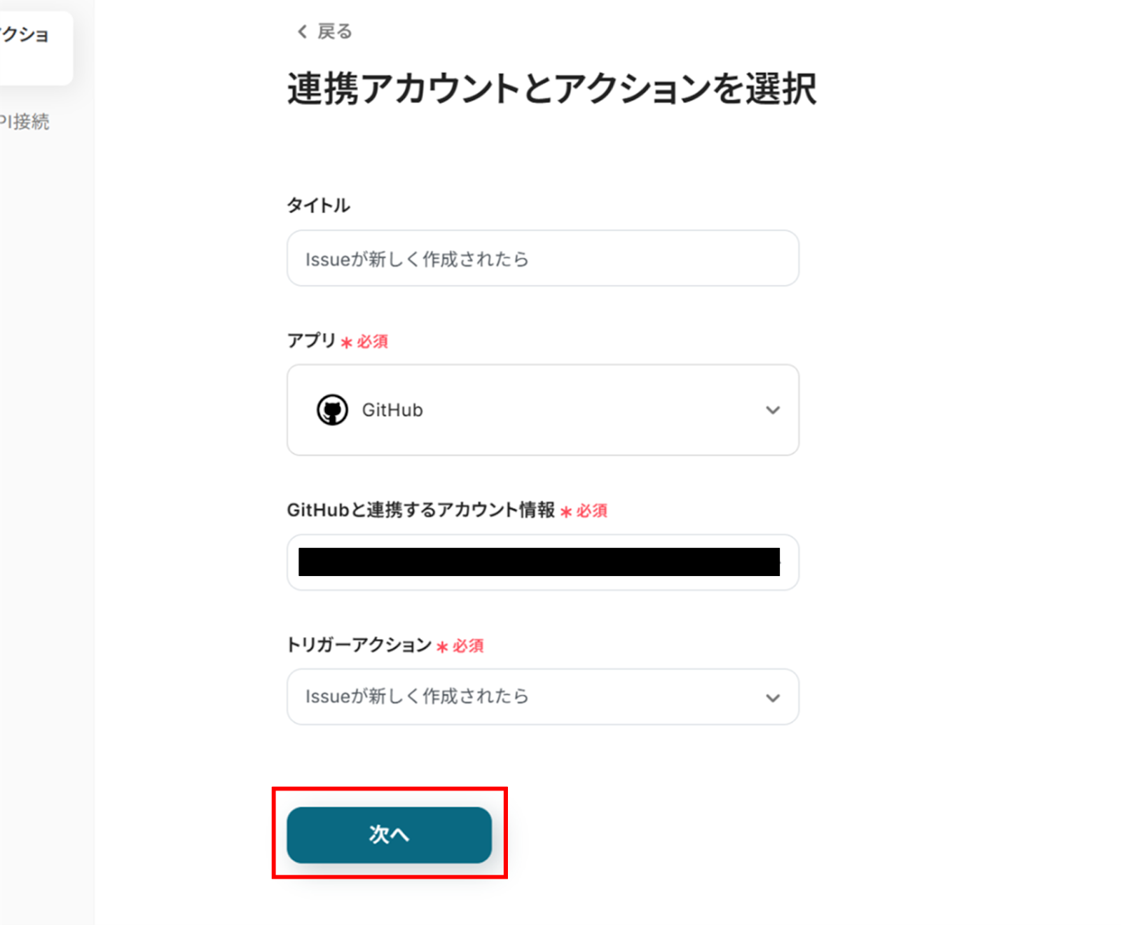 (2)「連携アカウントとアクションを選択」画面から、GitHubと連携するアカウント情報に誤りがないかを確認し、トリガーアクションは「Issueが新しく作成されたら」のままで「次へ」をクリックします。