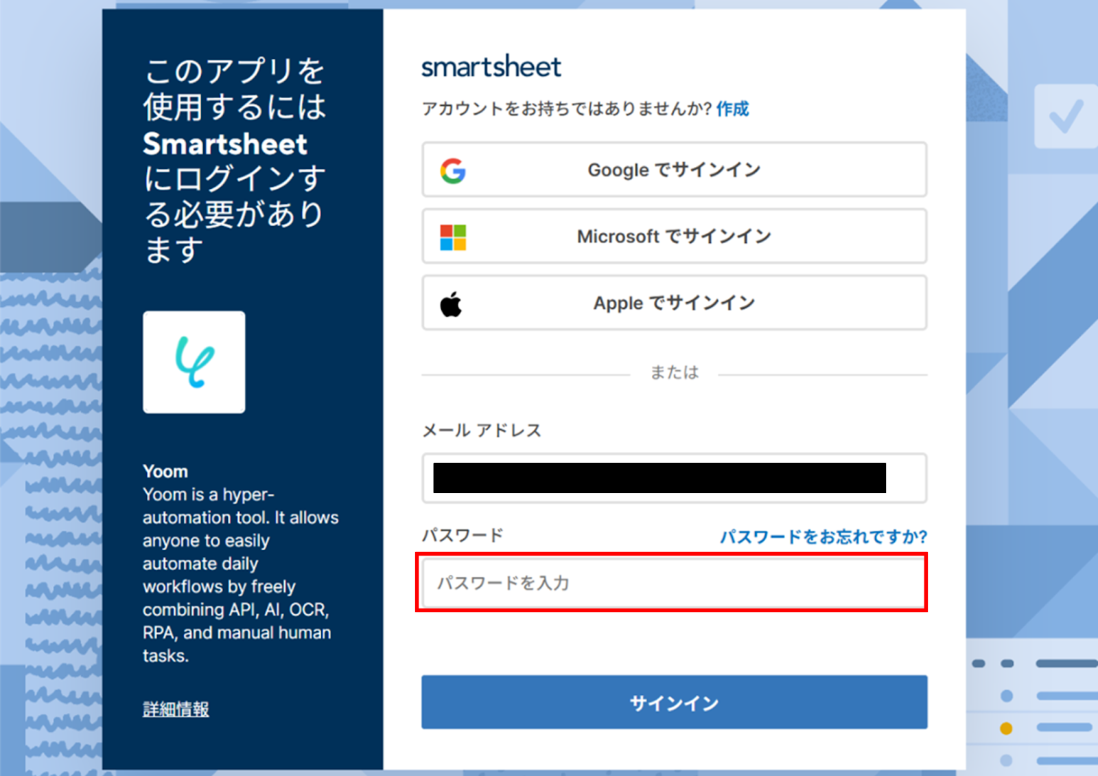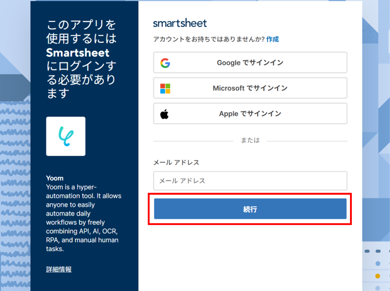 Smartsheetのログイン画面から、メールアドレスを入力し「続行」をクリックしましょう。