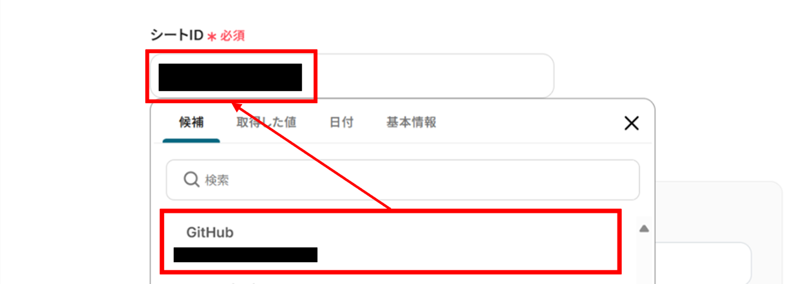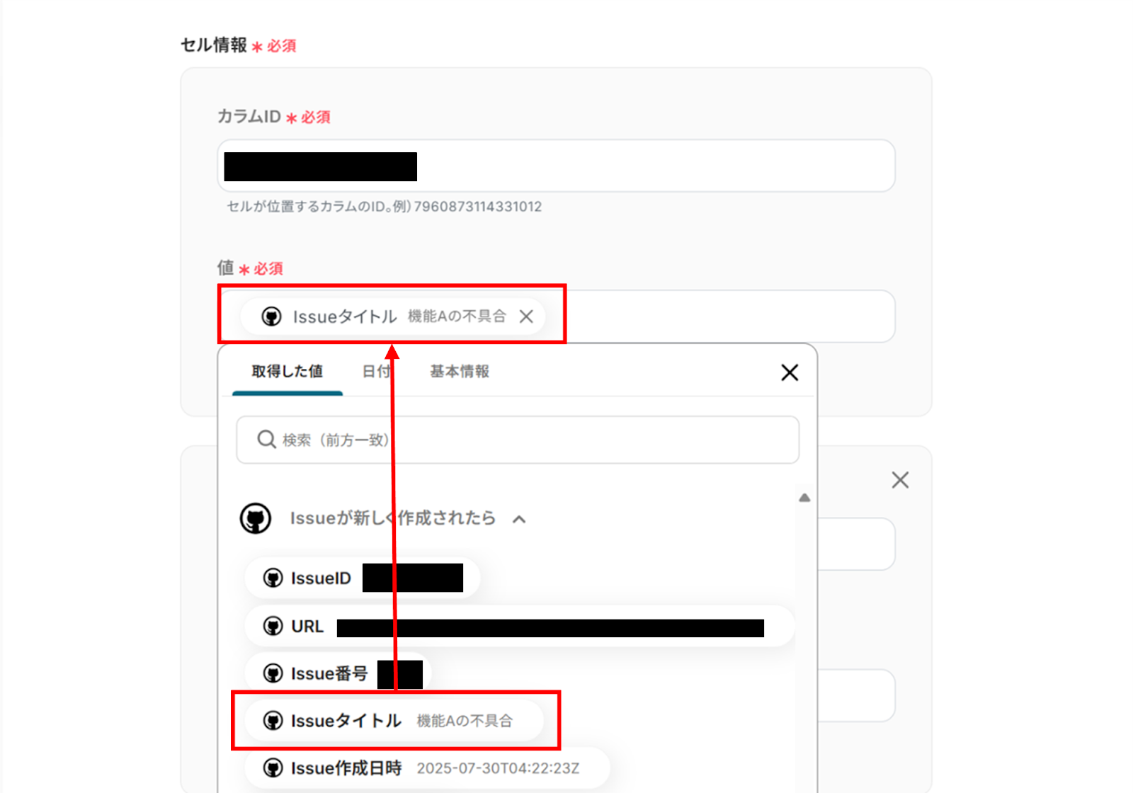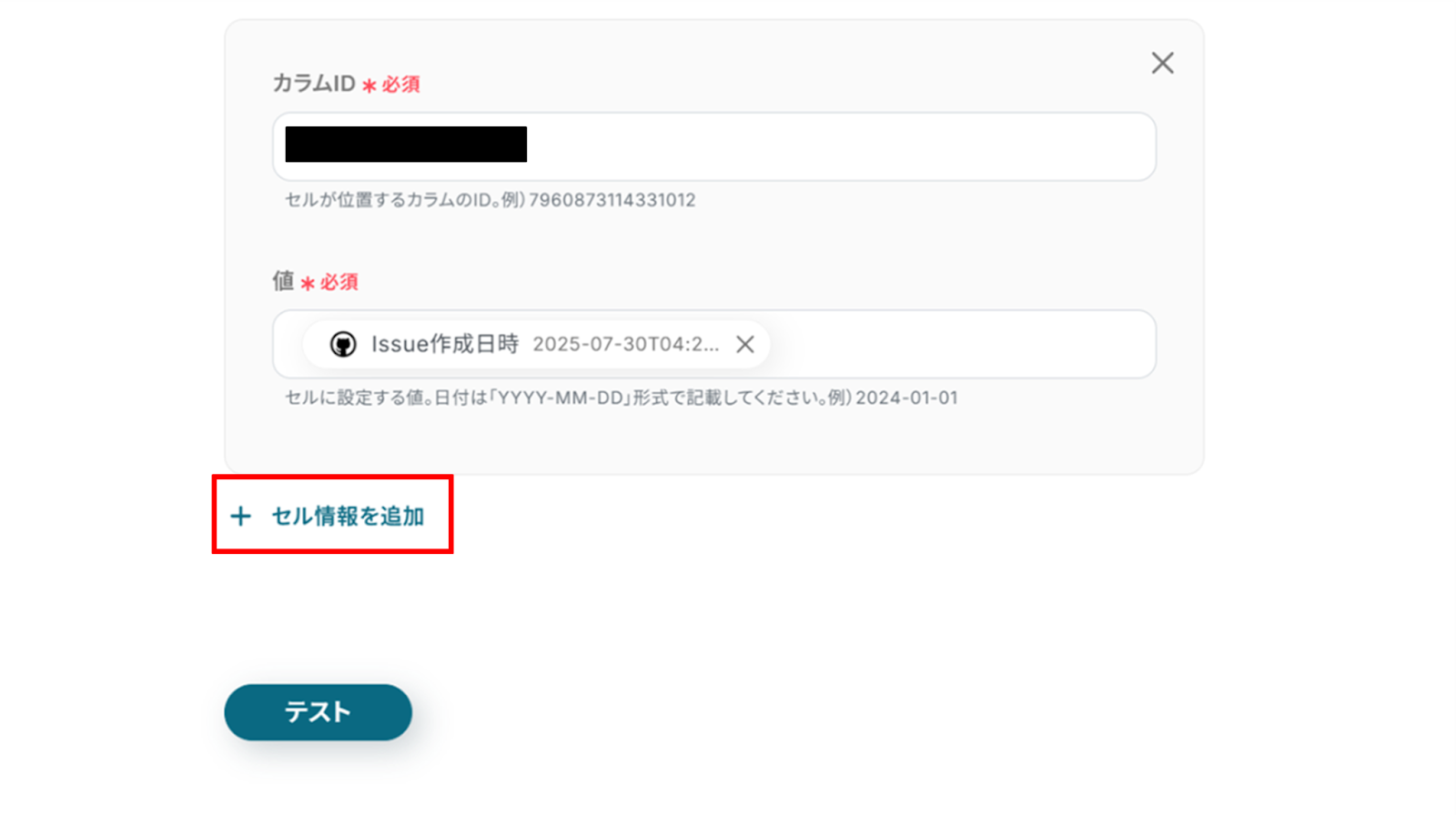- Smartsheetに行を追加する際に、GitHubのIssueから取得したどの情報(Issueのタイトル、本文、担当者、ラベルなど)をSmartsheetのどの列に追加するかを、任意で設定してください。
