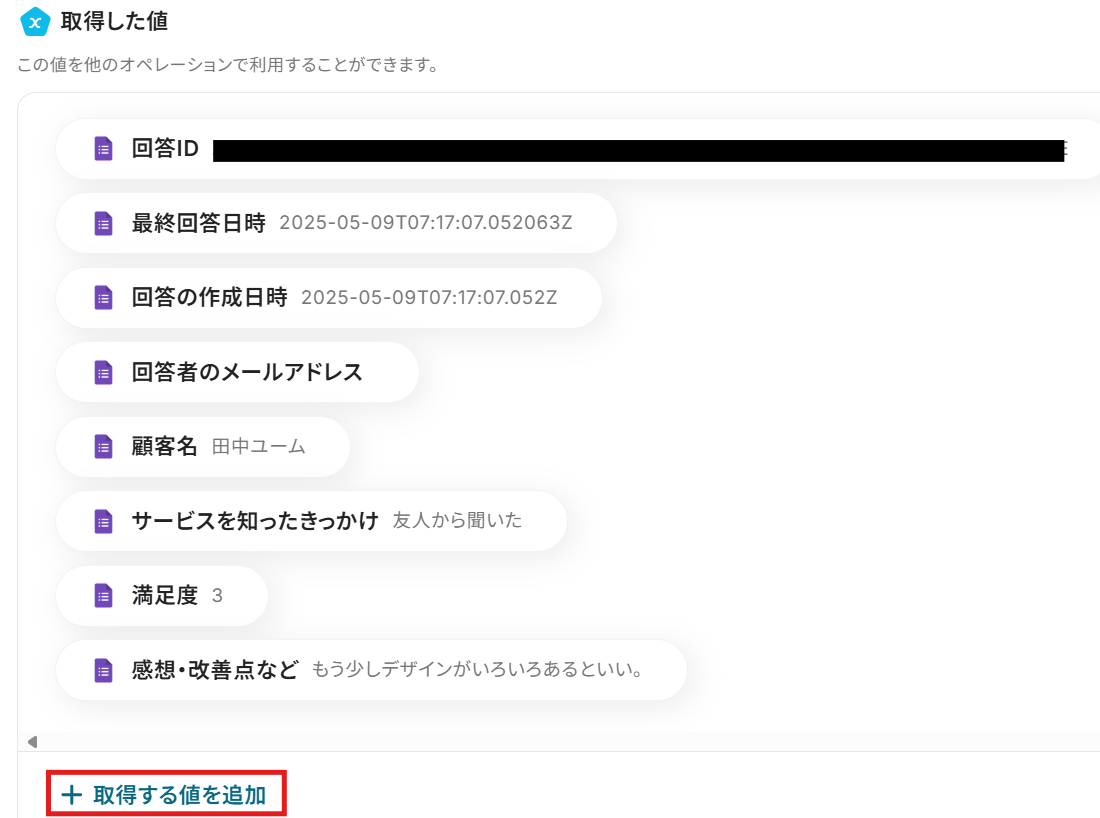 回答が足りない場合「取得する値を追加」をクリックし、ヘルプを参考に回答を取得してください。