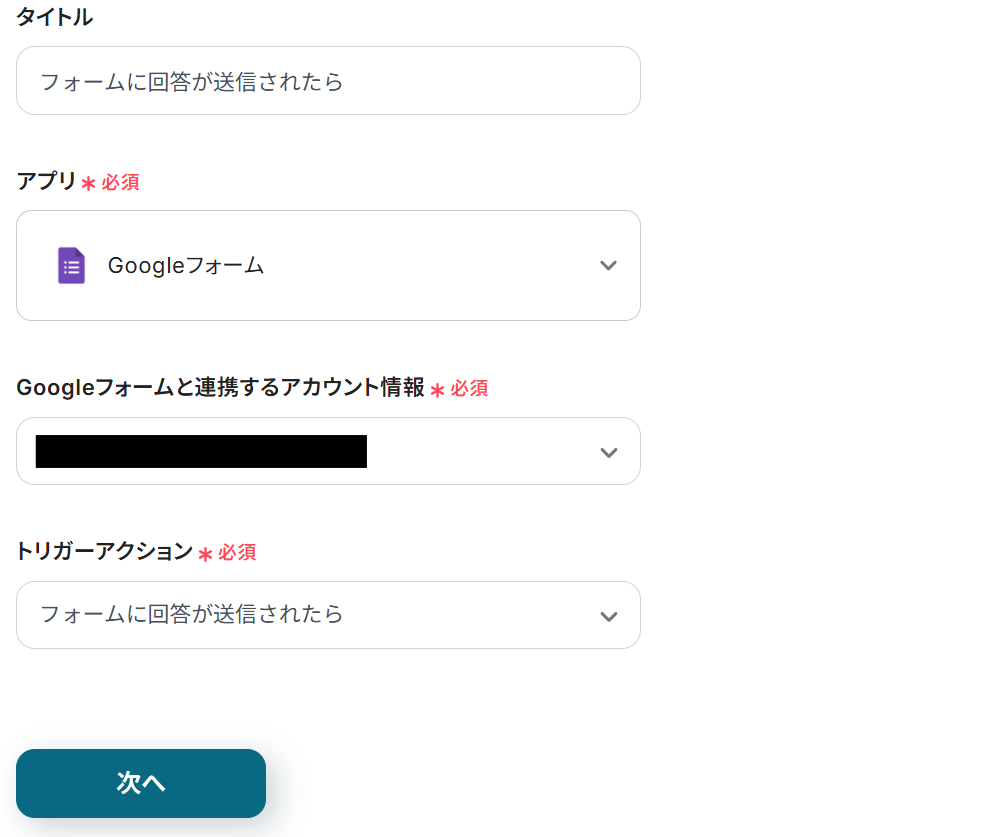 タイトルと連携するアカウント情報を任意で設定し、アクションはテンプレート通りのまま「次へ」をクリックして進んでください。