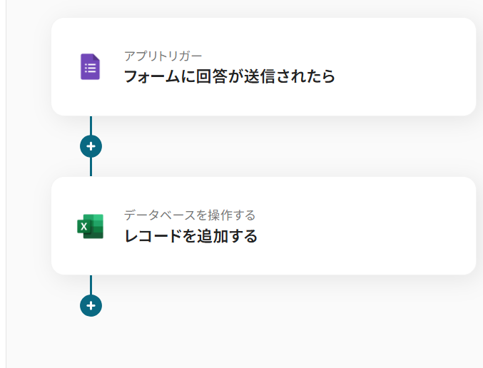 Googleフォームに新しいアンケート回答が送信されるたびに、その内容をMicrosoft Excelの指定したシートに自動で転記する基本的な連携フローです。