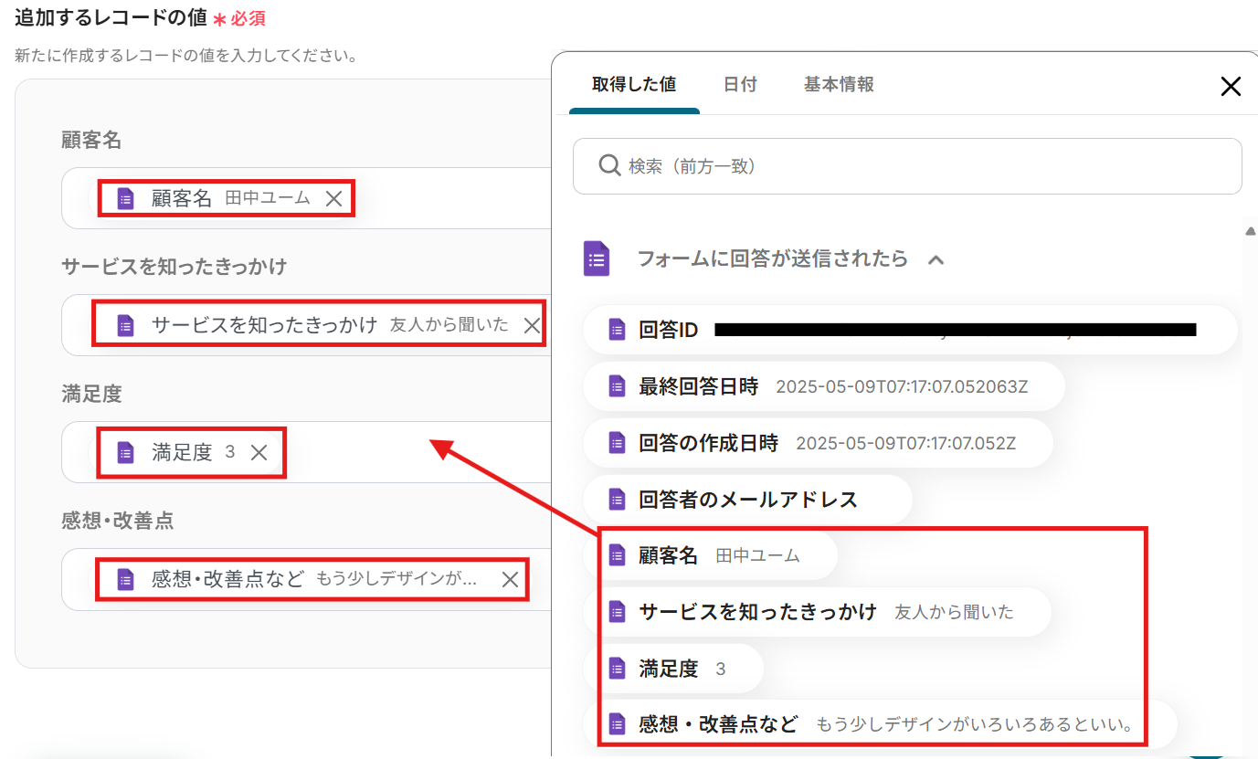 次に進み、追加するレコードの値を以下のようにアウトプットから設定していきます。