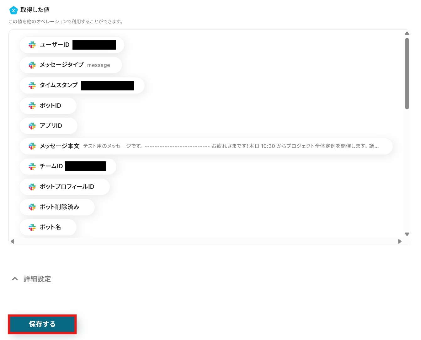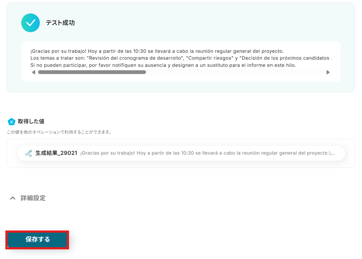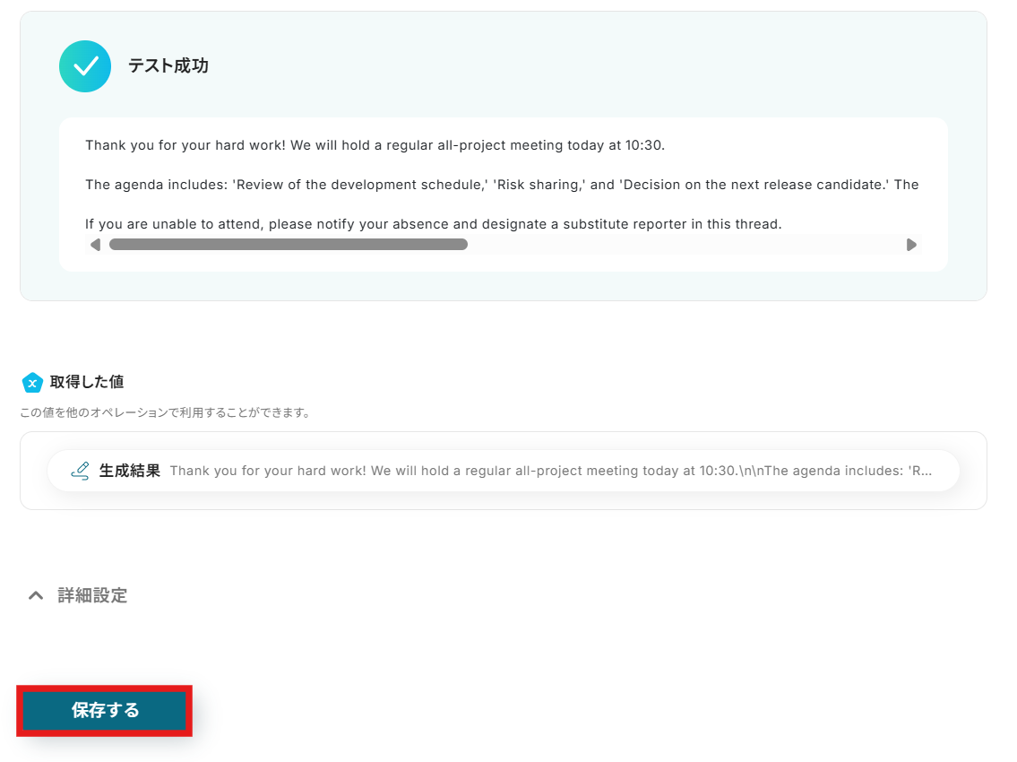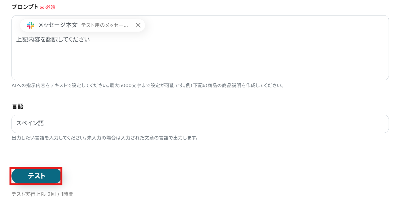 テストが成功すると「テスト成功」の画面が表示され、Slackのメッセージを翻訳した情報を引用できるようになります。 テストが成功したら、「保存する」をクリックするのを忘れないようにしましょう!