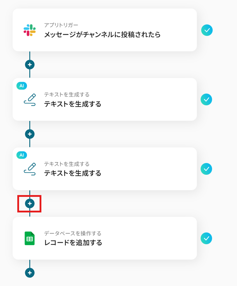 なお、さらに翻訳したい言語を追加したい場合は、以下の赤枠をクリックし、「テキストを生成する」アクションを追加することで対応可能です。 「テキストを生成する」の詳しい設定方法については以下のリンク先をチェックしてみてくださいね。「テキストを生成する」の設定方法