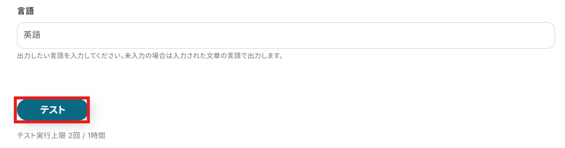 言語: 翻訳したい言語を設定しましょう。本記事では例として英語を設定しました。 設定が終わったら「テスト」をクリックしましょう。