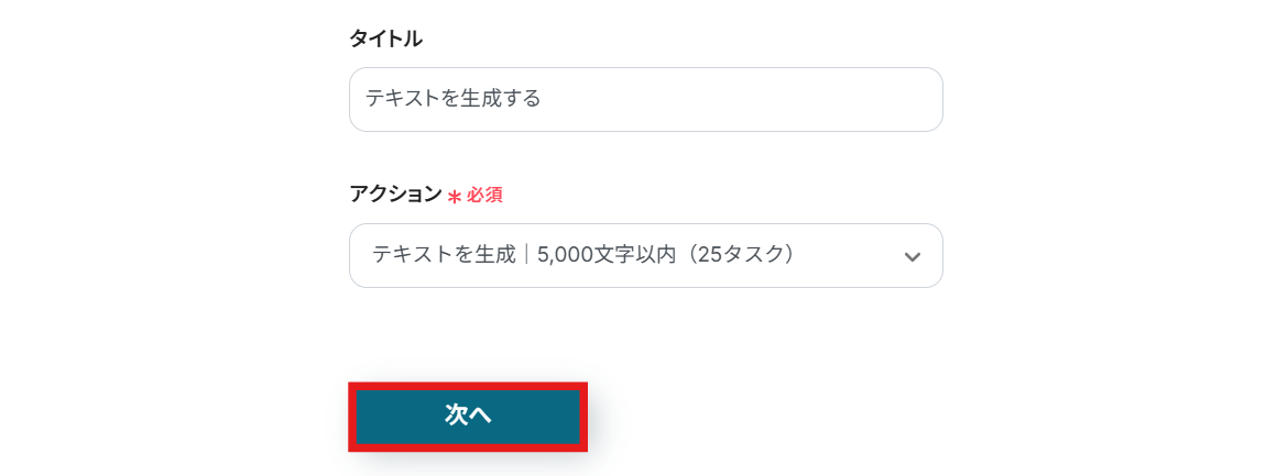 先ほどのアクションと内容は同じです。 本記事では、今回もタイトルとアクションはそのままにして「次へ」をクリックします。