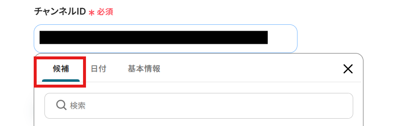 チャンネルID: 入力欄をクリックすると候補が表示されるので、その中から選択しましょう。