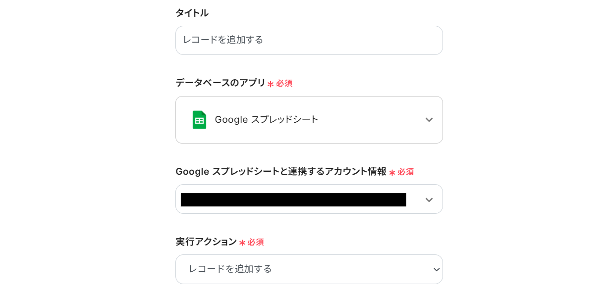 Google スプレッドシートと連携するアカウント情報を設定します。 アクションは「レコードを追加する」を選択します。