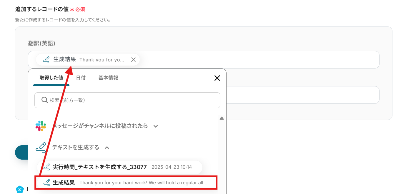 追加するレコードの値 を設定しましょう。 各項目は入力欄をクリックすると、翻訳した文章を引用できます。 設定し終えたら、「テスト」をクリックしましょう。
