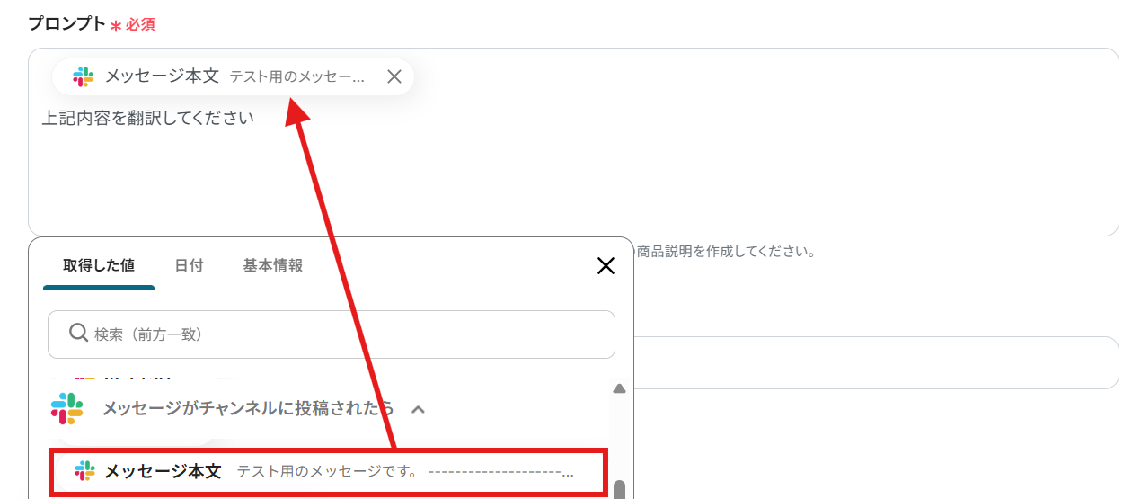 プロンプト: プロンプトは元から入力されています。編集欄をクリックすると以下のようにSlackから取得した情報が表示されるので、引用しましょう。