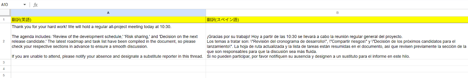 この記事では、「AIで多言語を自動翻訳してGoogle スプレッドシートに結果を保存する方法」 について、プログラミング不要で実現する具体的な手順をご紹介しました。 Google スプレッドシートを活用した翻訳結果の管理は、単純な繰り返し作業にかかる時間を削減するだけでなく、翻訳ミスや情報漏れといったヒューマンエラーを防ぐ上でも効果的です。