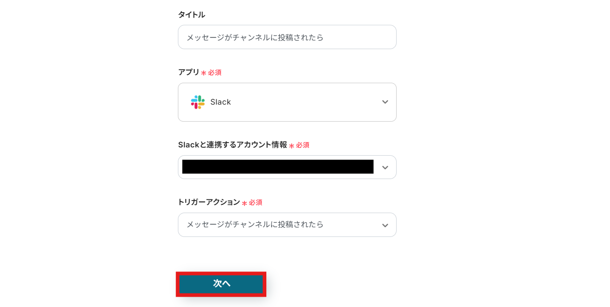 Slackと連携するアカウント情報を設定します。 トリガーは「メッセージがチャンネルに投稿されたら」を選択します。 設定が終わったら「次へ」をクリックします。