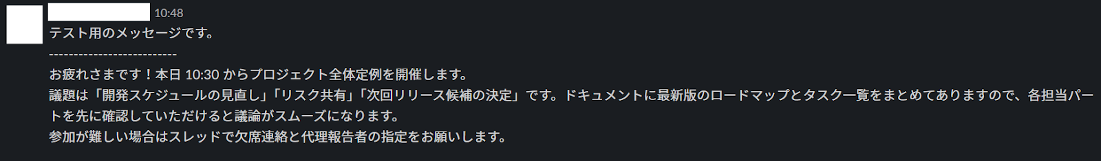 設定が終わったらテストするため、Slackの画面でメッセージを送信してください。 なお、今回はテストとして以下のようなメッセージを送信しています。