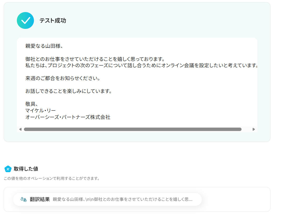 テストに成功すると、取得した値に「翻訳結果」が追加されます。