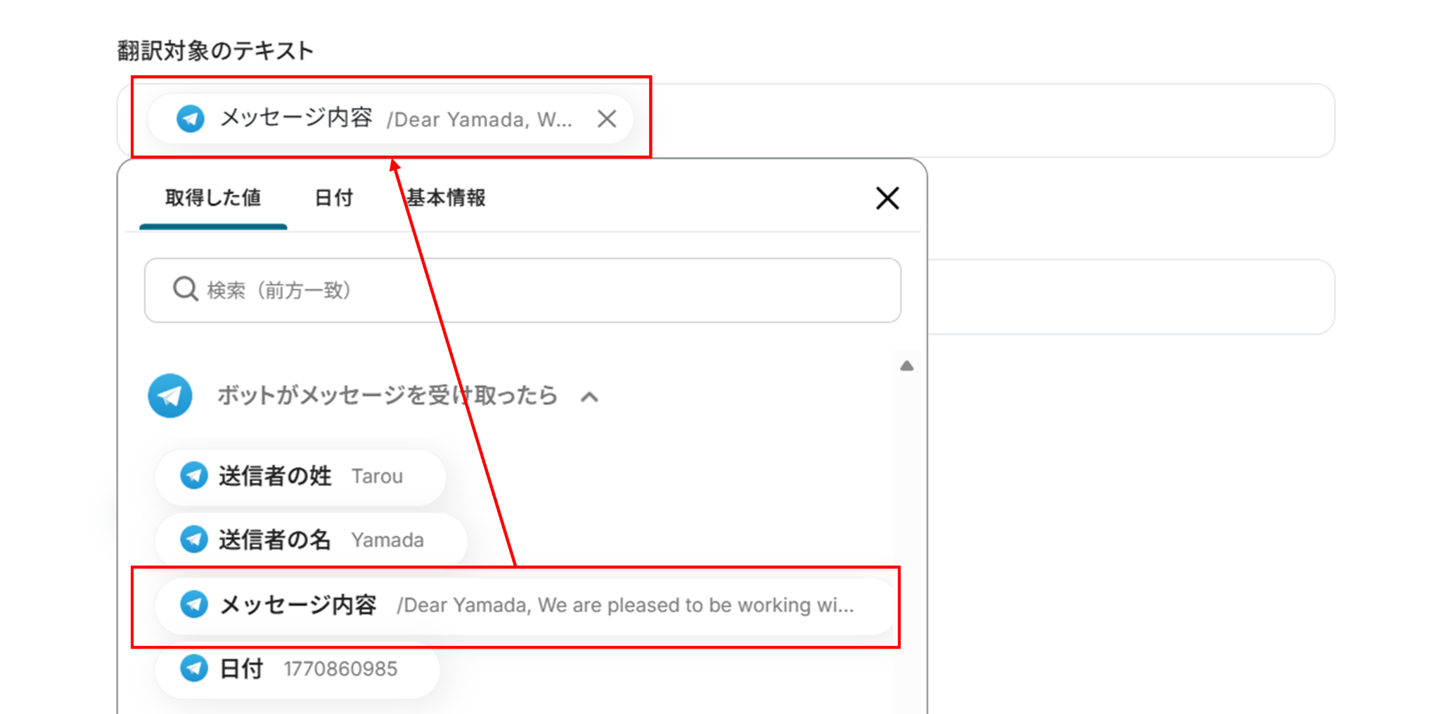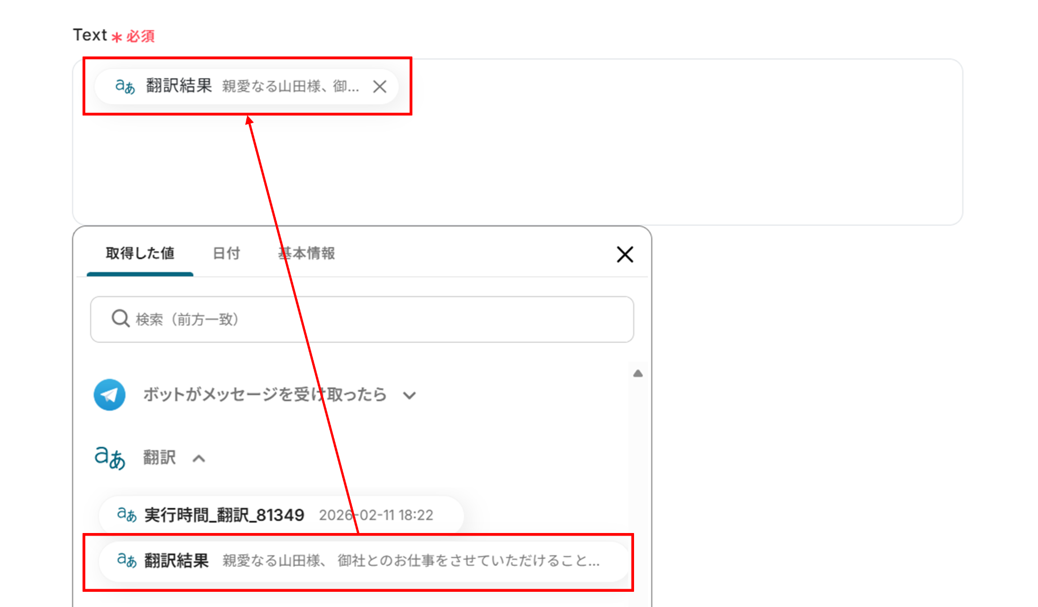 (2)「翻訳対象のテキスト」に先ほど取得した値から「メッセージ内容」を入力します。