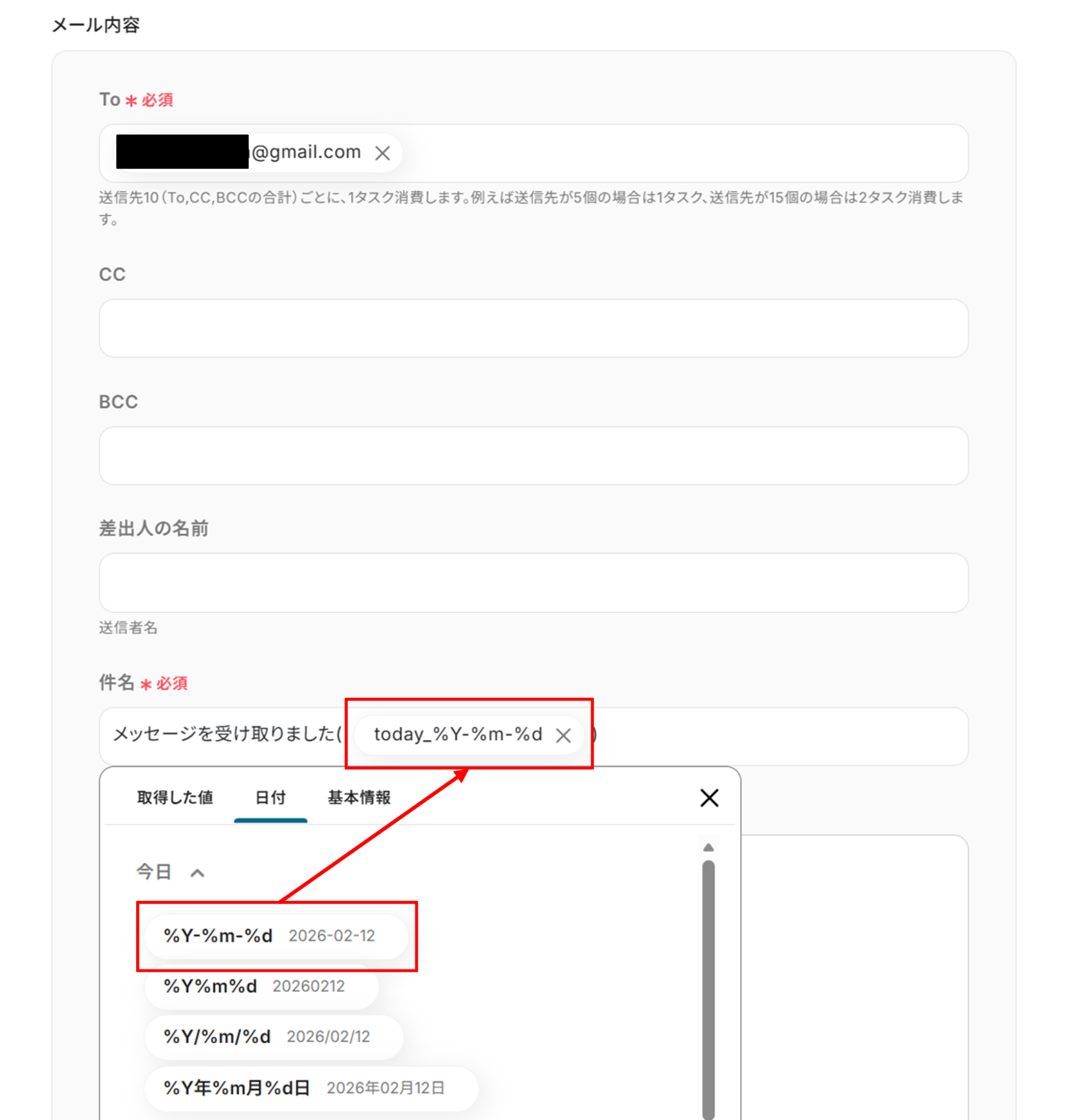 - 「メールを送る」オペレーションでは、音声ファイルを受け取りたいメールアドレスを宛先に設定し、件名や本文も自由にカスタマイズしてください。