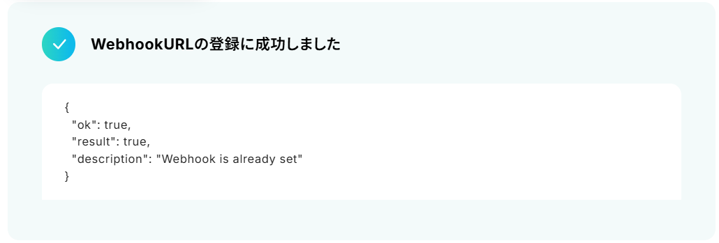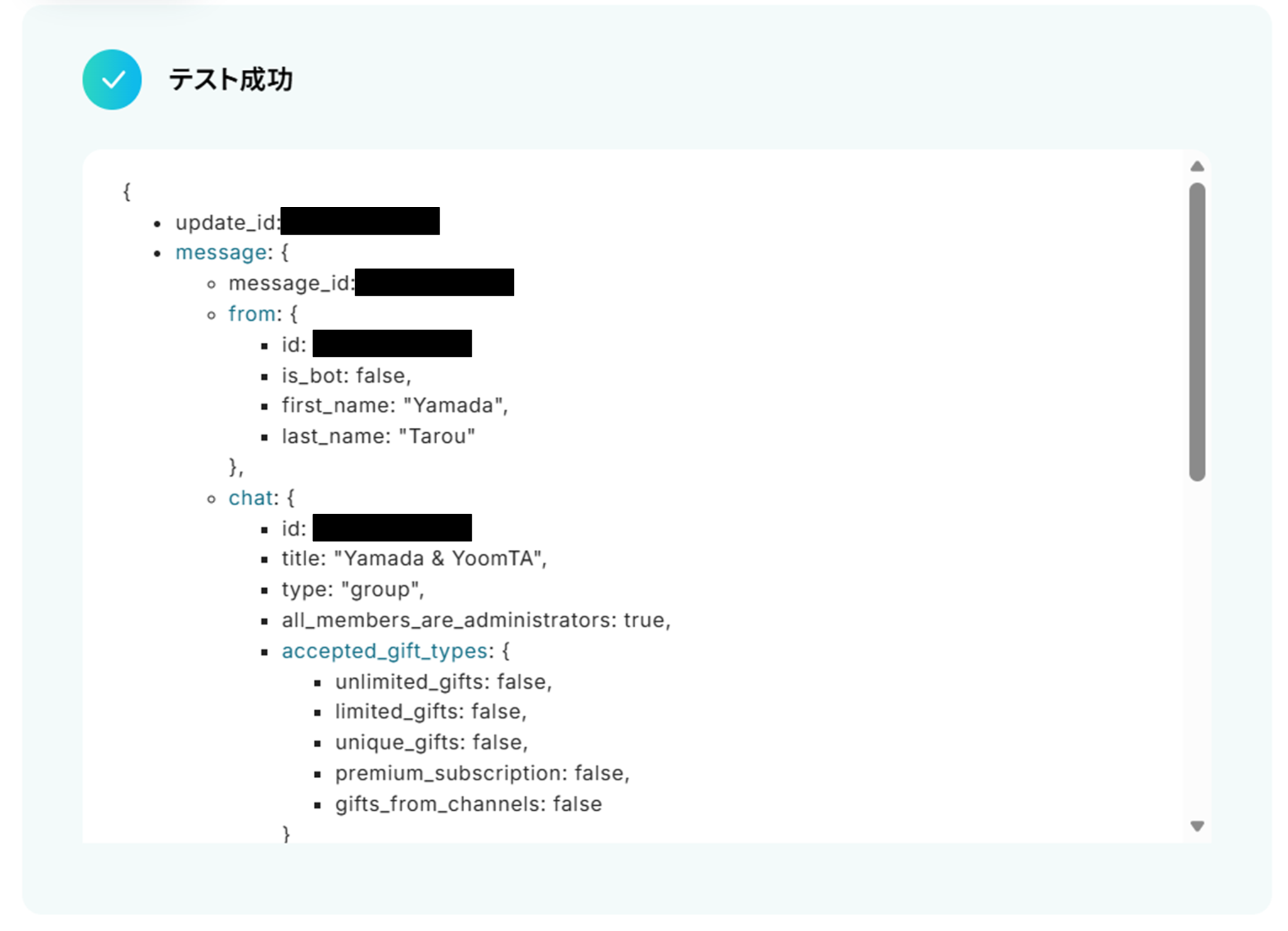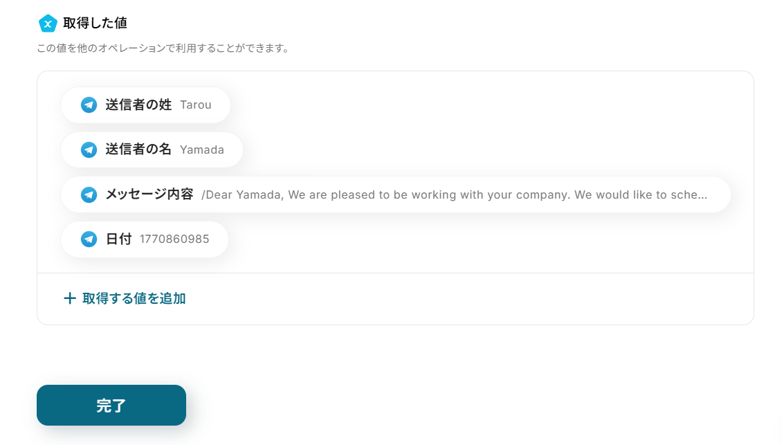 テストに成功すると、取得した値にTelegramの情報が反映されます。