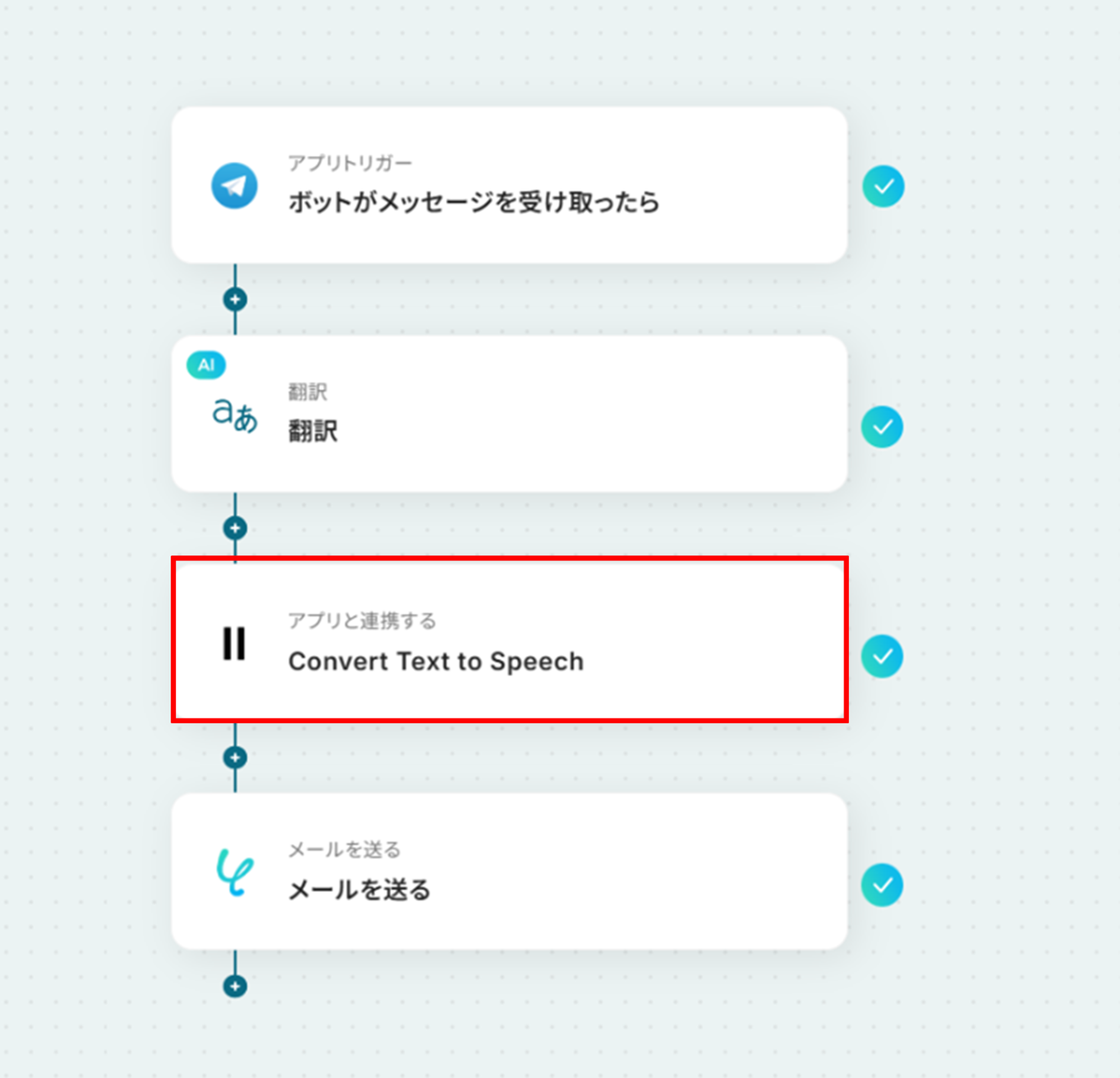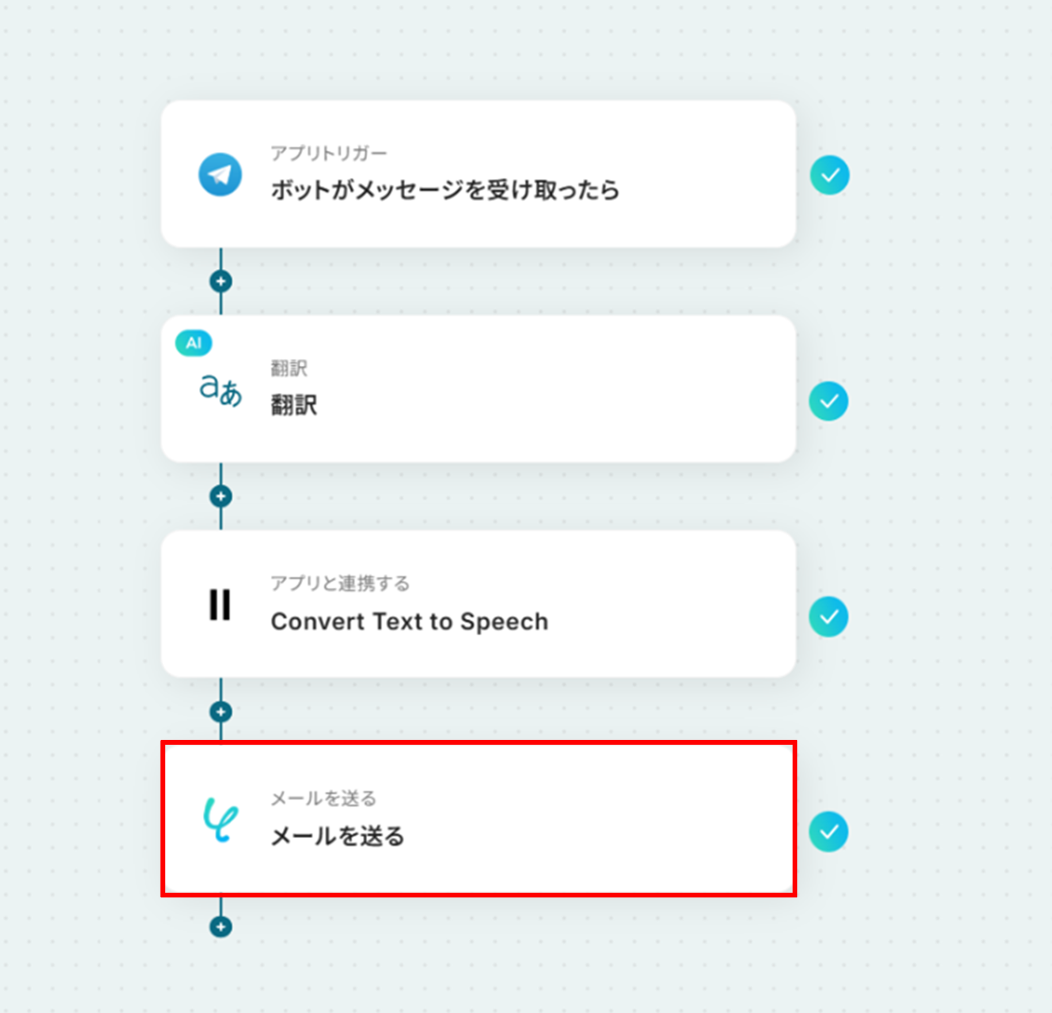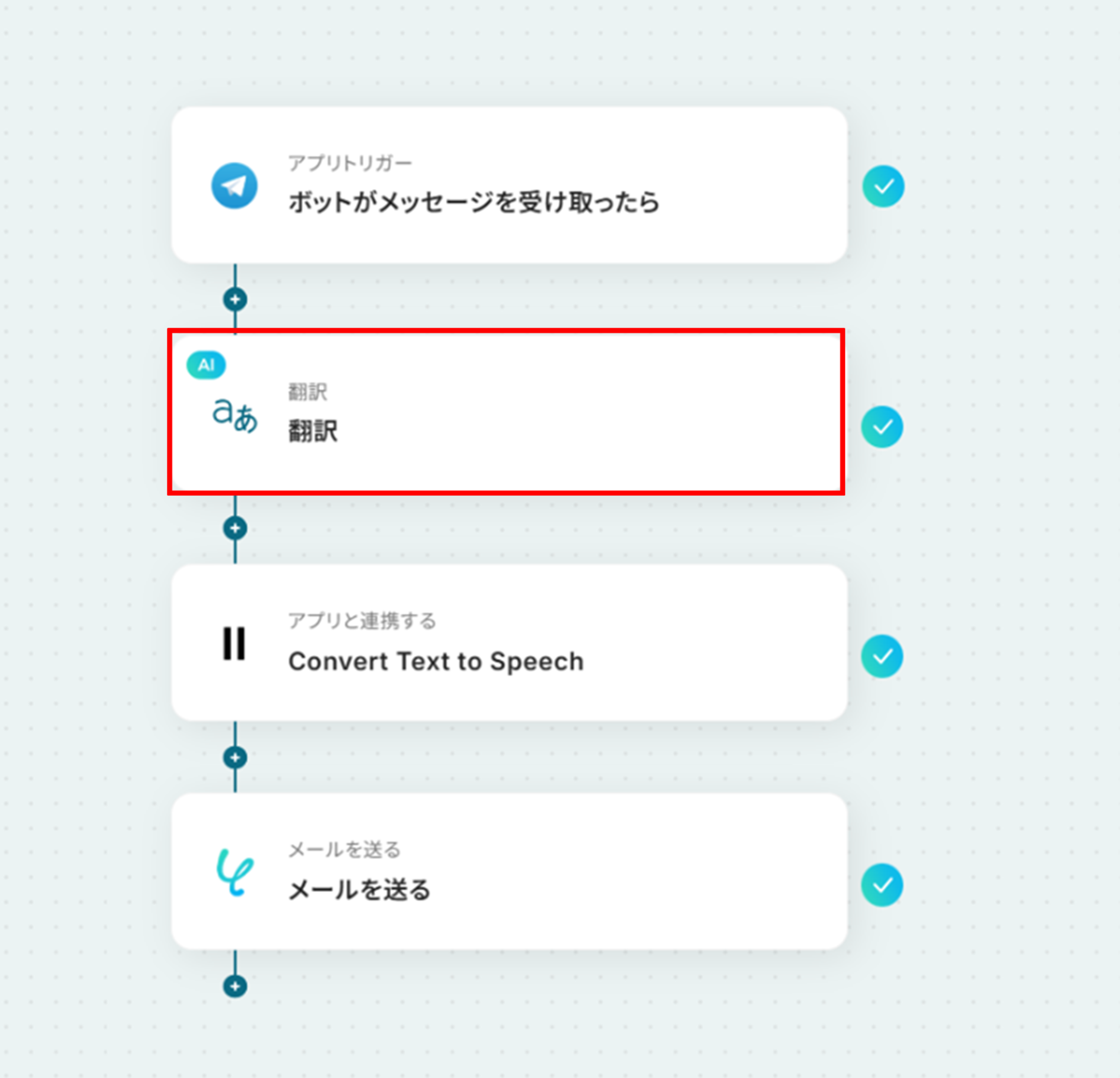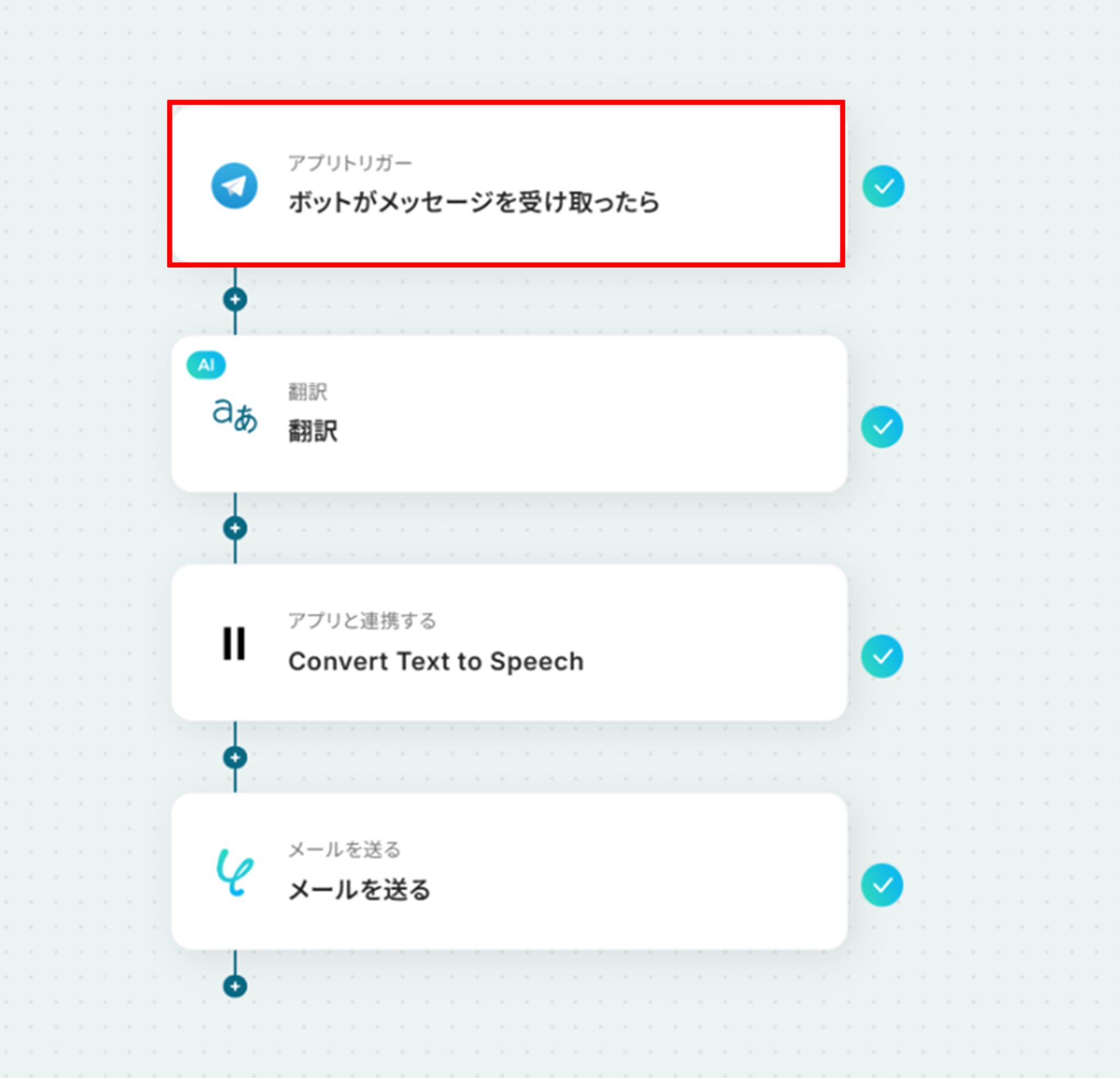 それではここから代表的な例として、Telegramでメッセージが送信されたら、その内容を自動で翻訳し、ElevenLabsで音声に変換してメールで送信するフローを解説していきます!