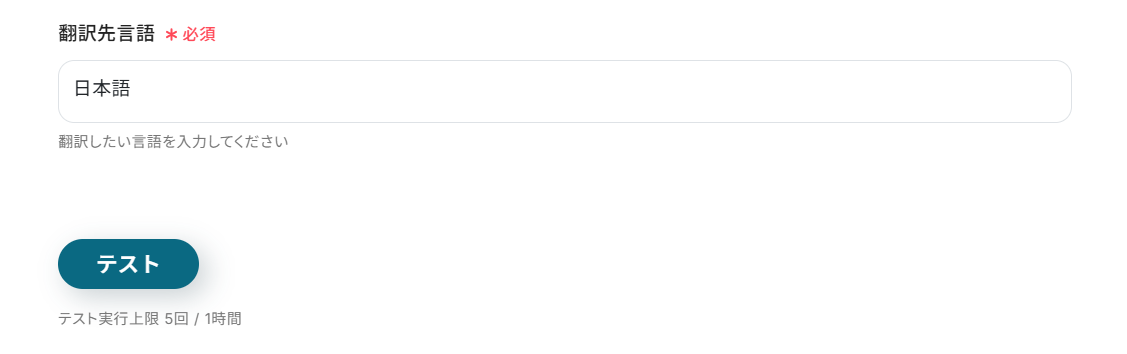 下へ進み、翻訳先言語を直接入力し「テスト」をクリックしましょう。