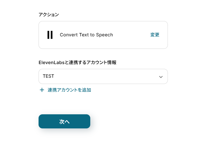 (2)「連携アカウントとアクションを選択」画面から、ElevenLabsと連携するアカウント情報に誤りがないかを確認し、アクションは「Convert Text to Speech」のままで「次へ」をクリックします。