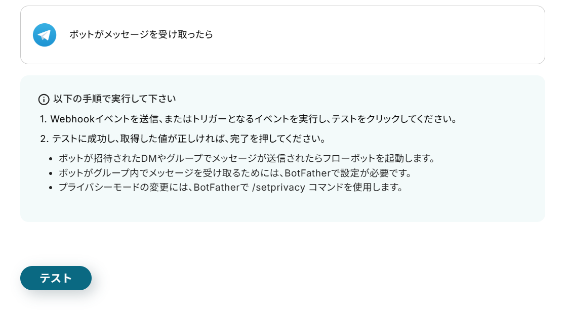 今回のテンプレートはボットが招待されたDMやグループでメッセージを送信することで起動します。下記画像の説明を参考に、Telegram にメッセージを送信しましょう。メッセージを送信したら、「テスト」をクリックしてください。