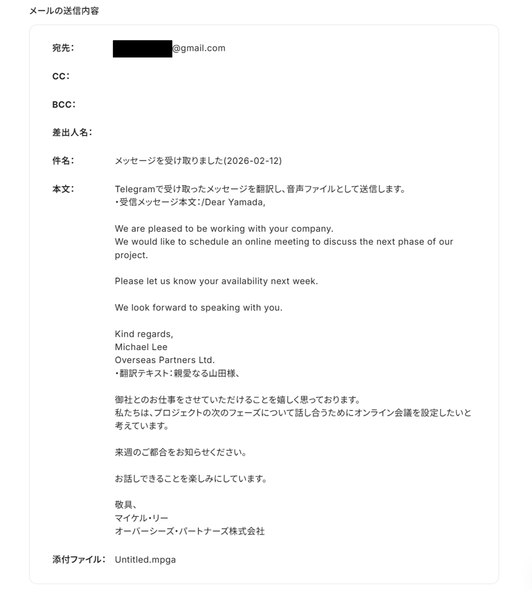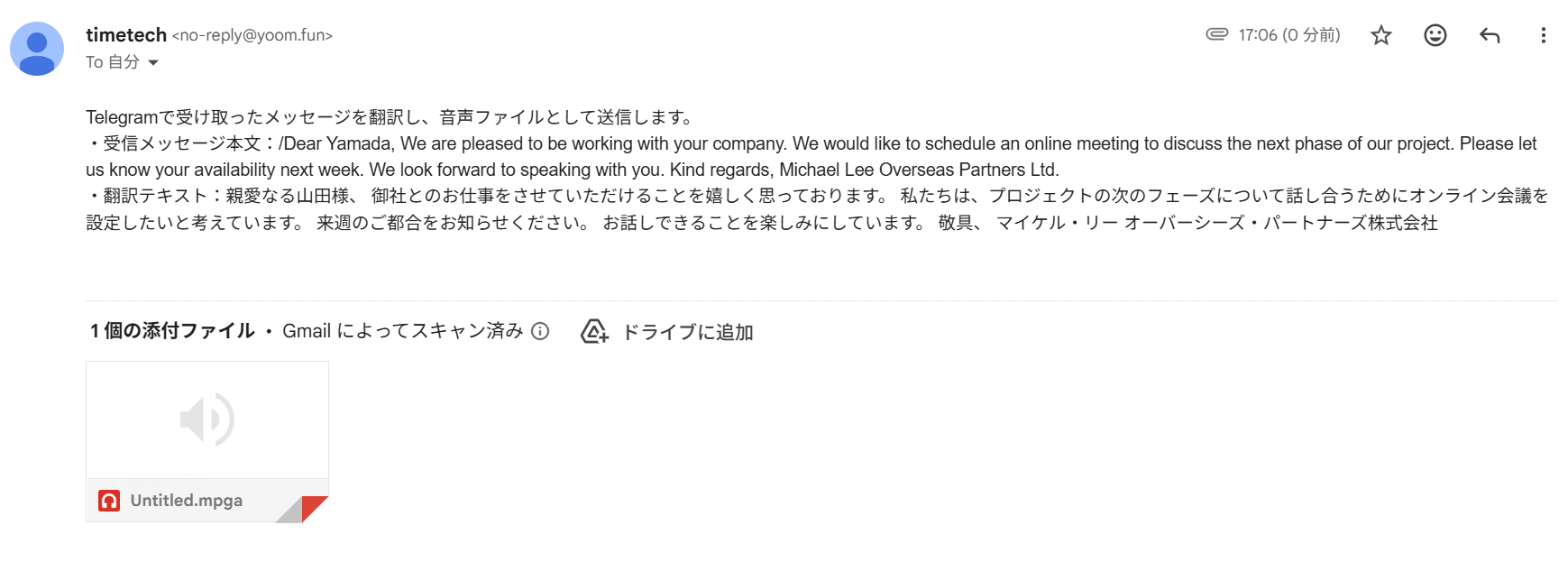 - Telegramのメッセージ受信をきっかけに翻訳から音声化まで自動処理されるため、これまで手作業で行っていた時間を短縮することができます。