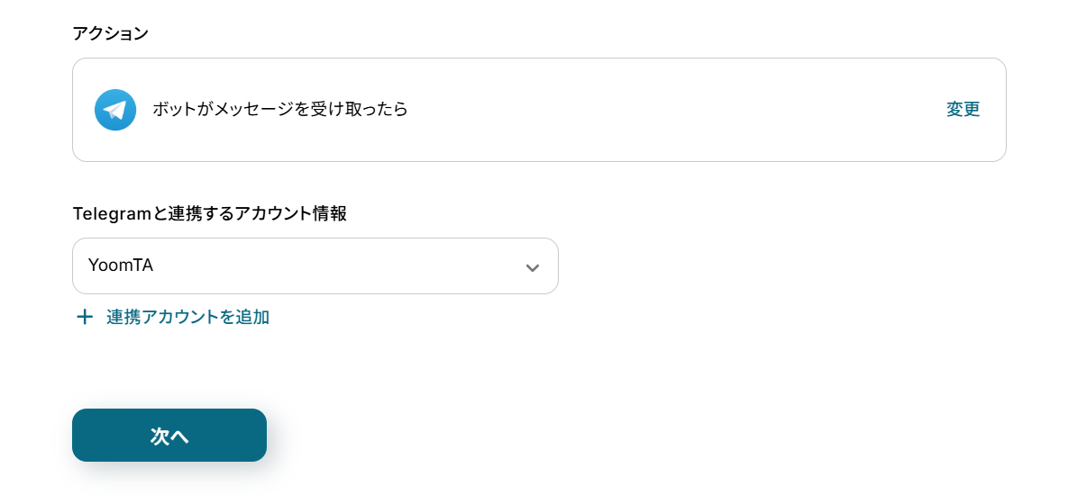 (2)「連携アカウントとアクションを選択」画面から、Telegramと連携するアカウント情報に誤りがないかを確認し、アクションは「ボットがメッセージを受け取ったら」のままで「次へ」をクリックしましょう。
