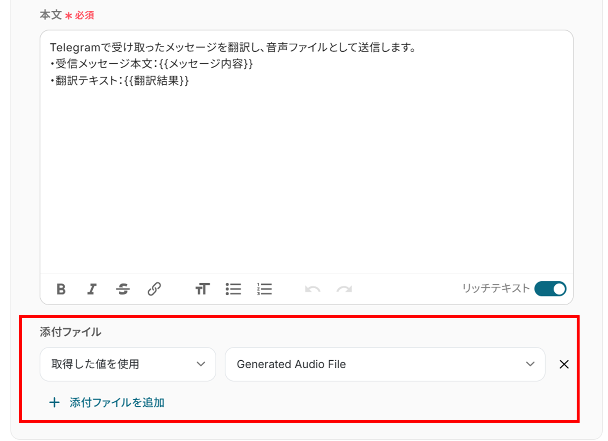 - Telegramで送信するメッセージの本文は自由にカスタマイズが可能です。前のステップで取得したタスク名や担当者、期日などの情報を含めることで、通知内容をより具体的に設定できます。